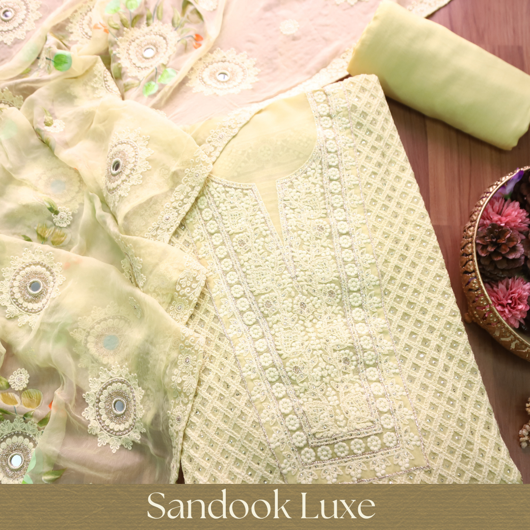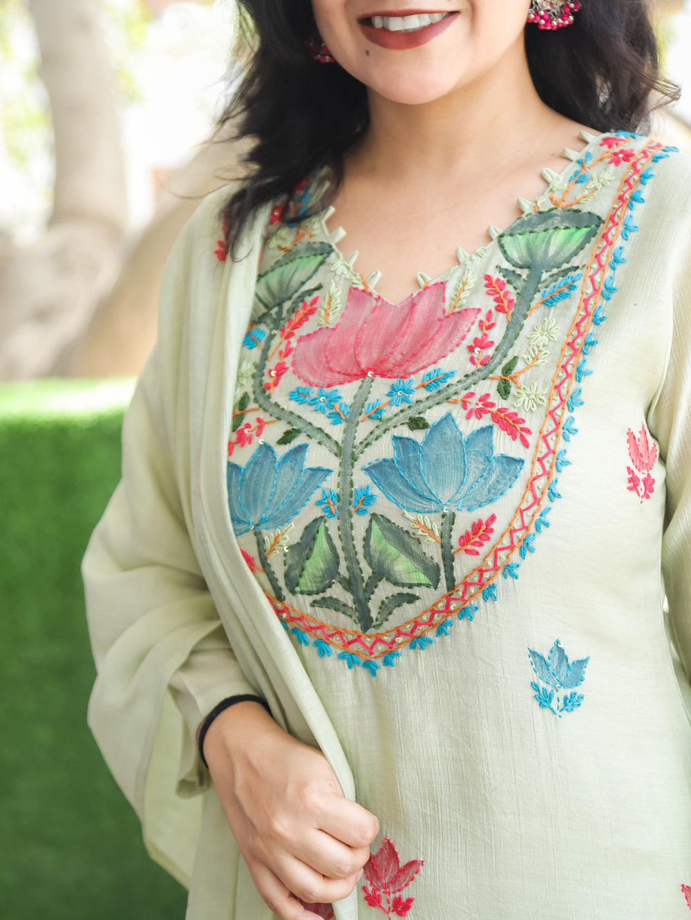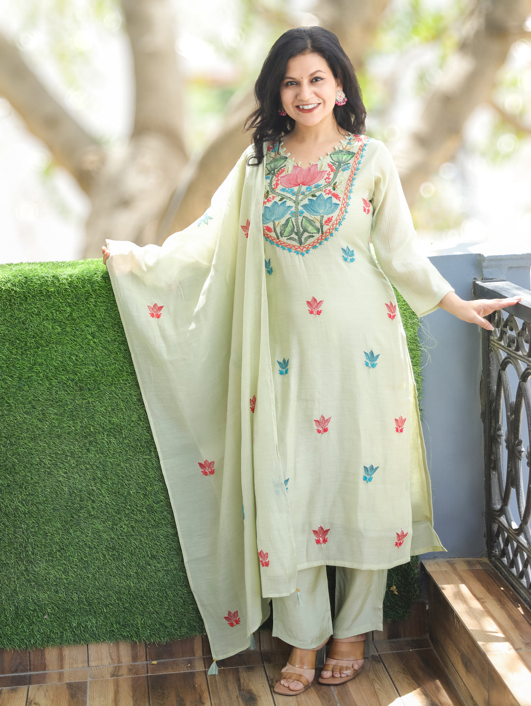 Elisha Mint Green Kantha Mul Chanderi 3 Piece Set