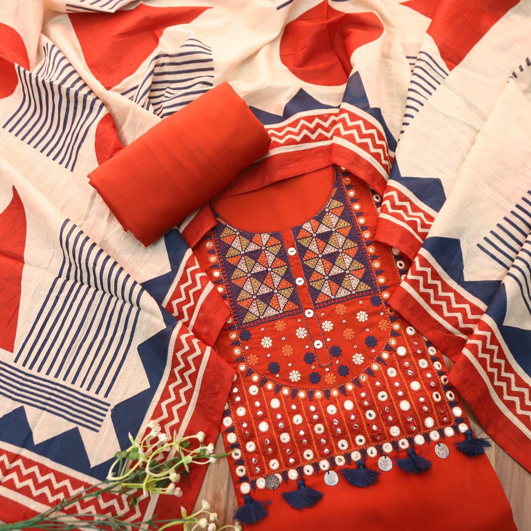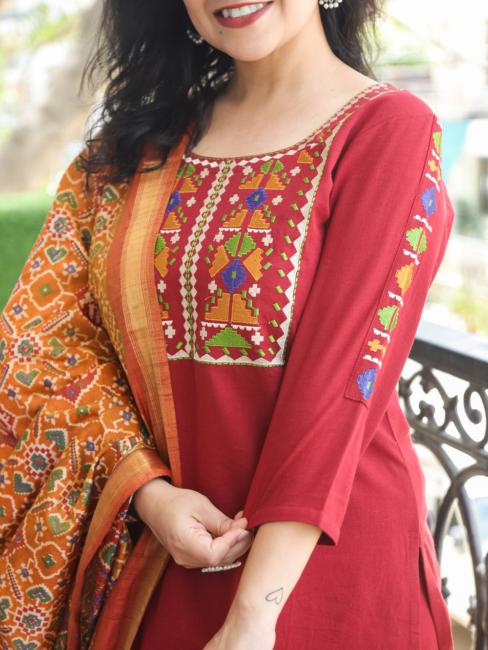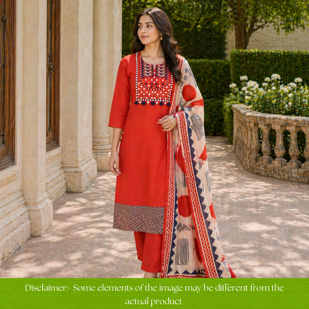 Alisha Burnt Red EEmbroidered Neck with Patra Rayon Set