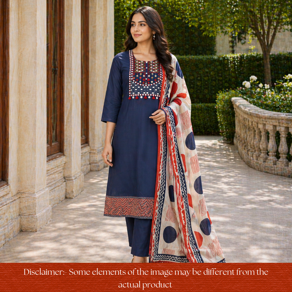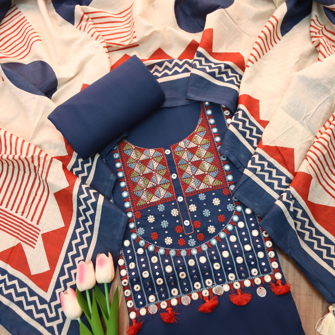 Alisha Denim Blue EEmbroidered Neck with Patra Rayon Set