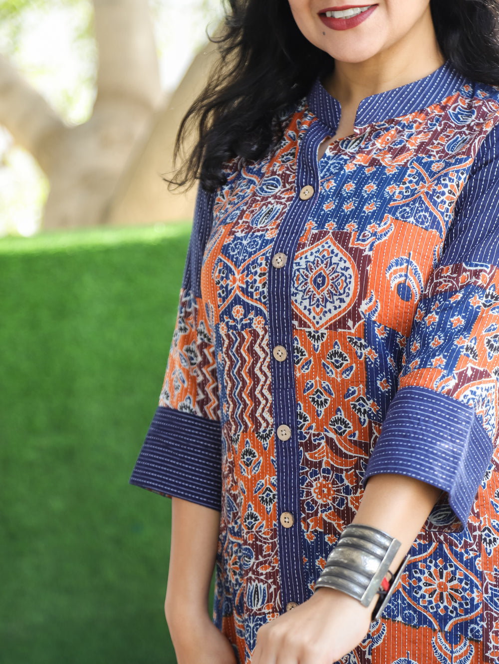 Manara Navy Blue Ban Collar with Ajrak Patches Kantha Button Down Work Cotton Kurti