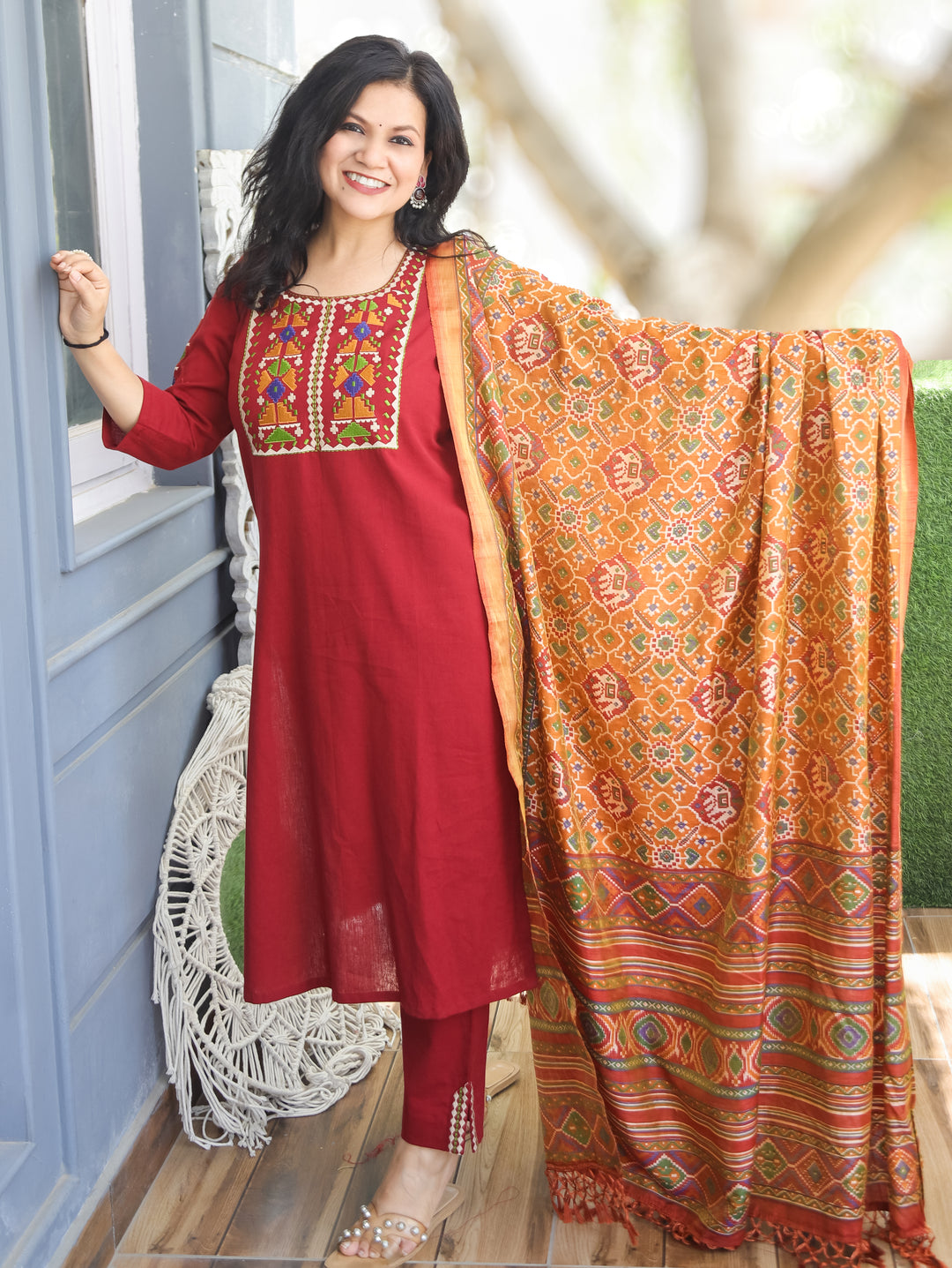 Seyri Berry Red Kutch Patch with Mirror Work Leaf Print Cotton Set
