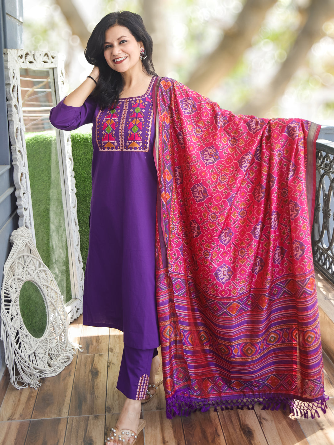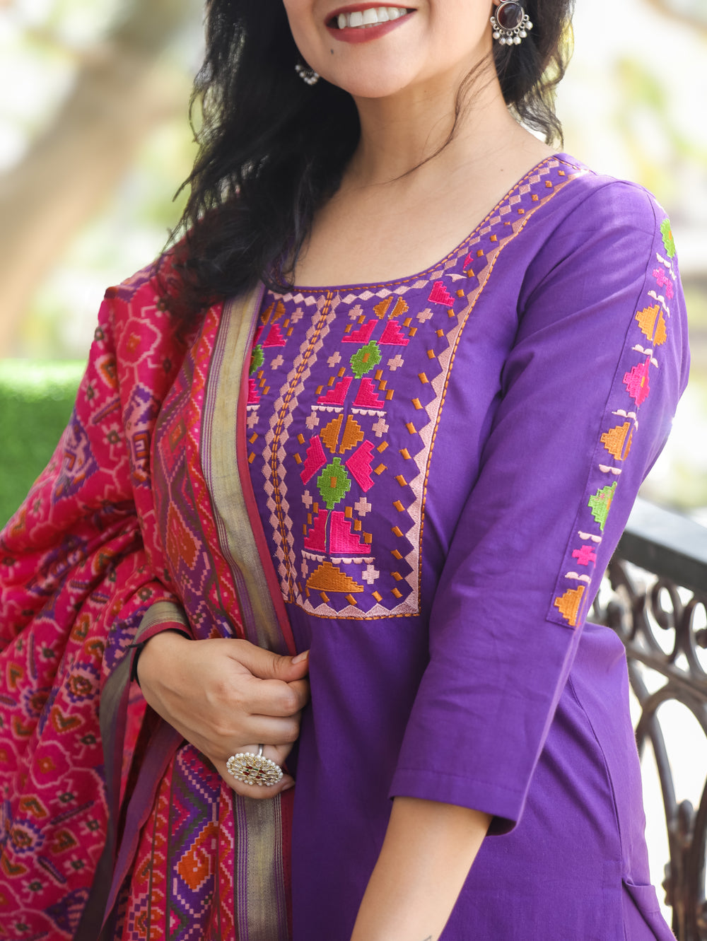 Elisha Helio Lilac Kantha Mul Chanderi 3 Piece Set