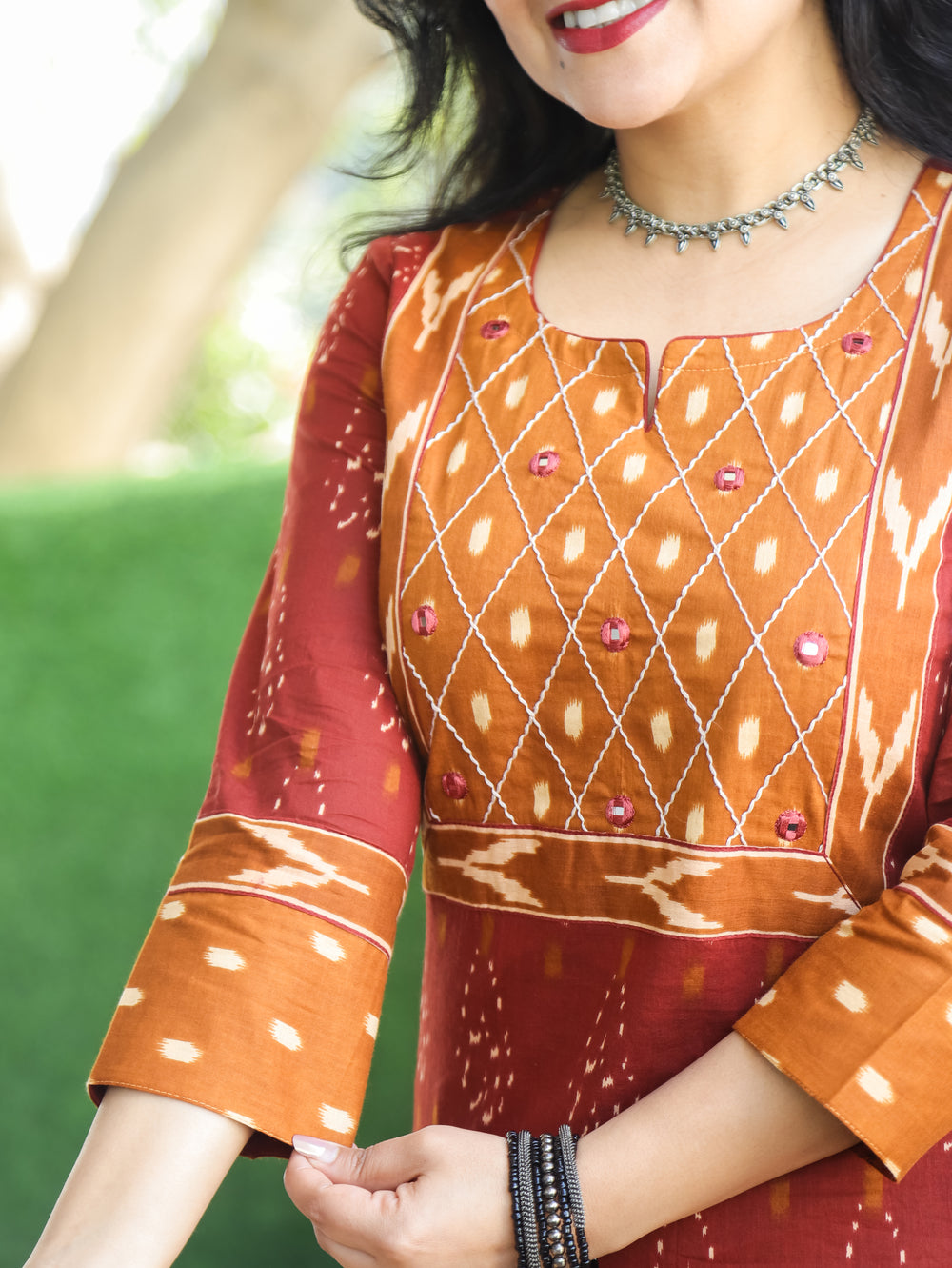 Kesariya Barn Rust with Peanut Yoke with Mirror Work Ikkat Printed Cotton Kurti