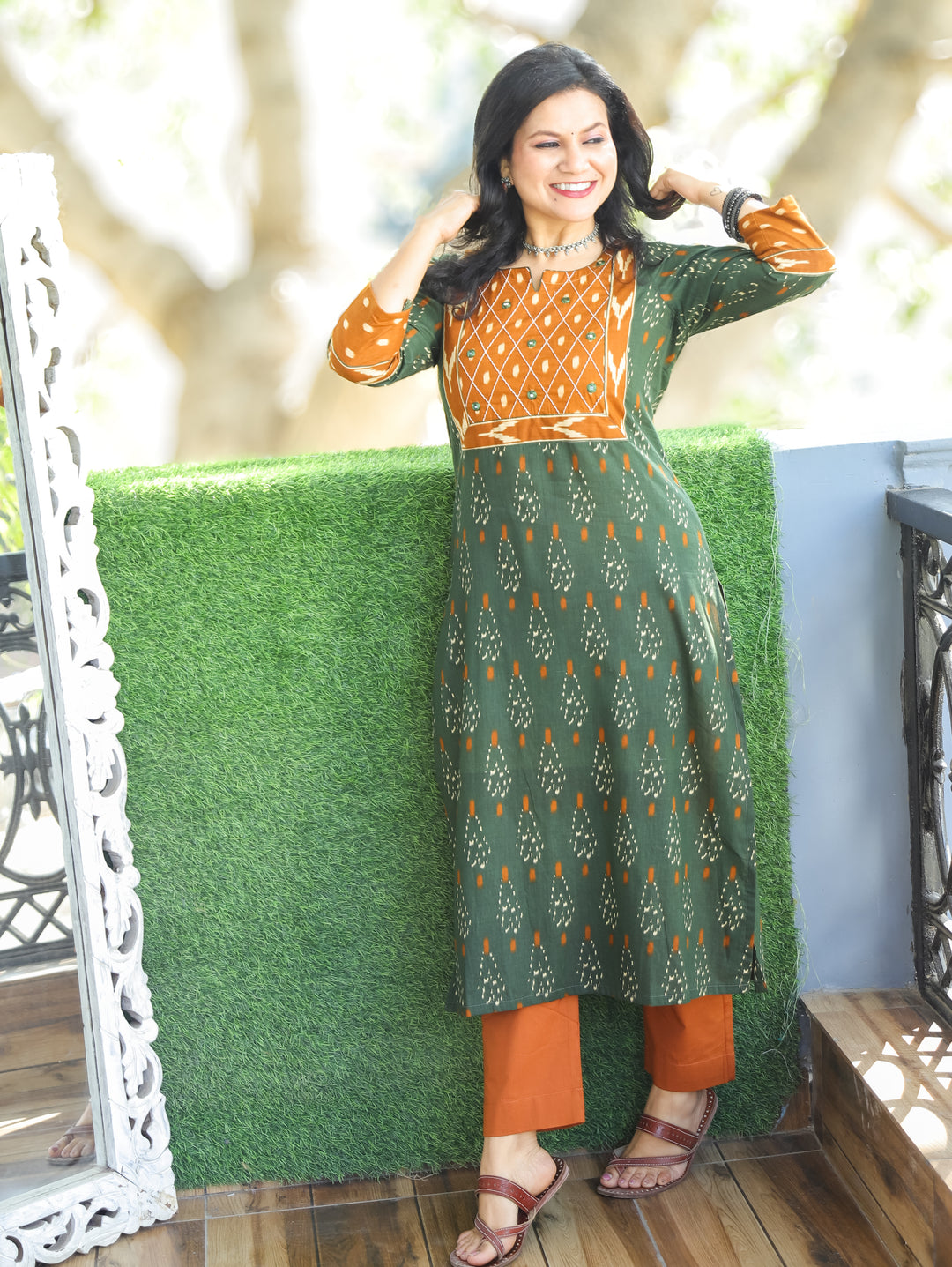 Kesariya Pine Green with Peanut Yoke with Mirror Work Ikkat Printed Cotton Kurti