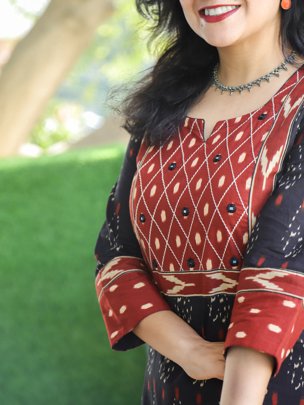 Kesariya Faded Black with Barn Rust Yoke with Mirror Work Ikkat Printed Cotton Kurti