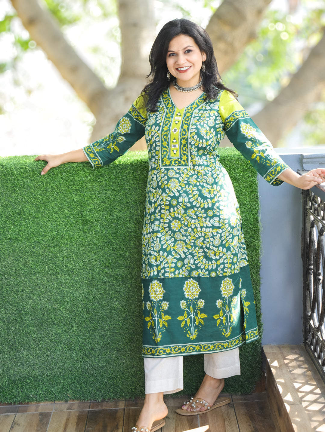 Vamika Pine Green with Embroidered Patch Yoke with Shell Work Cotton Kurti