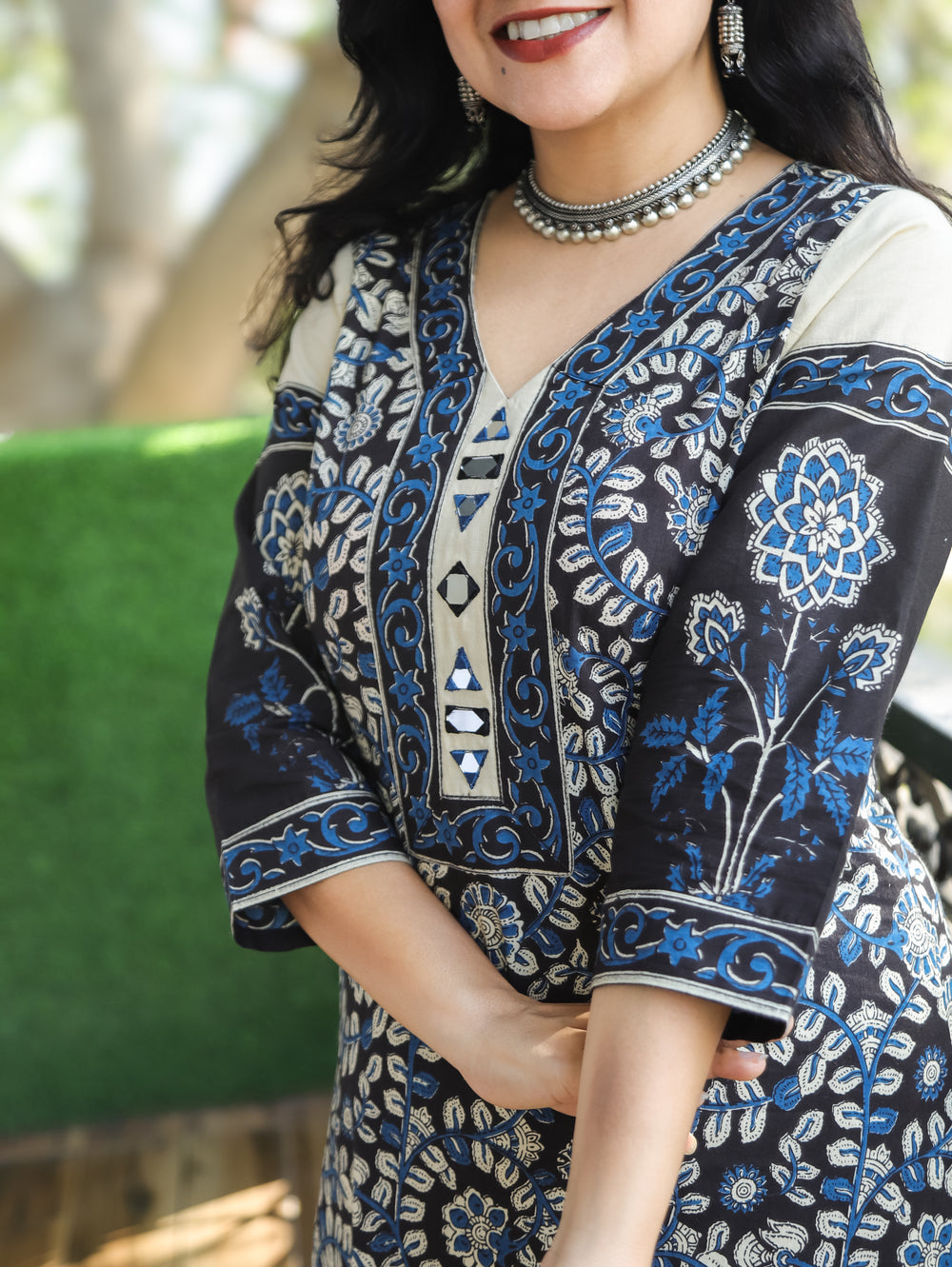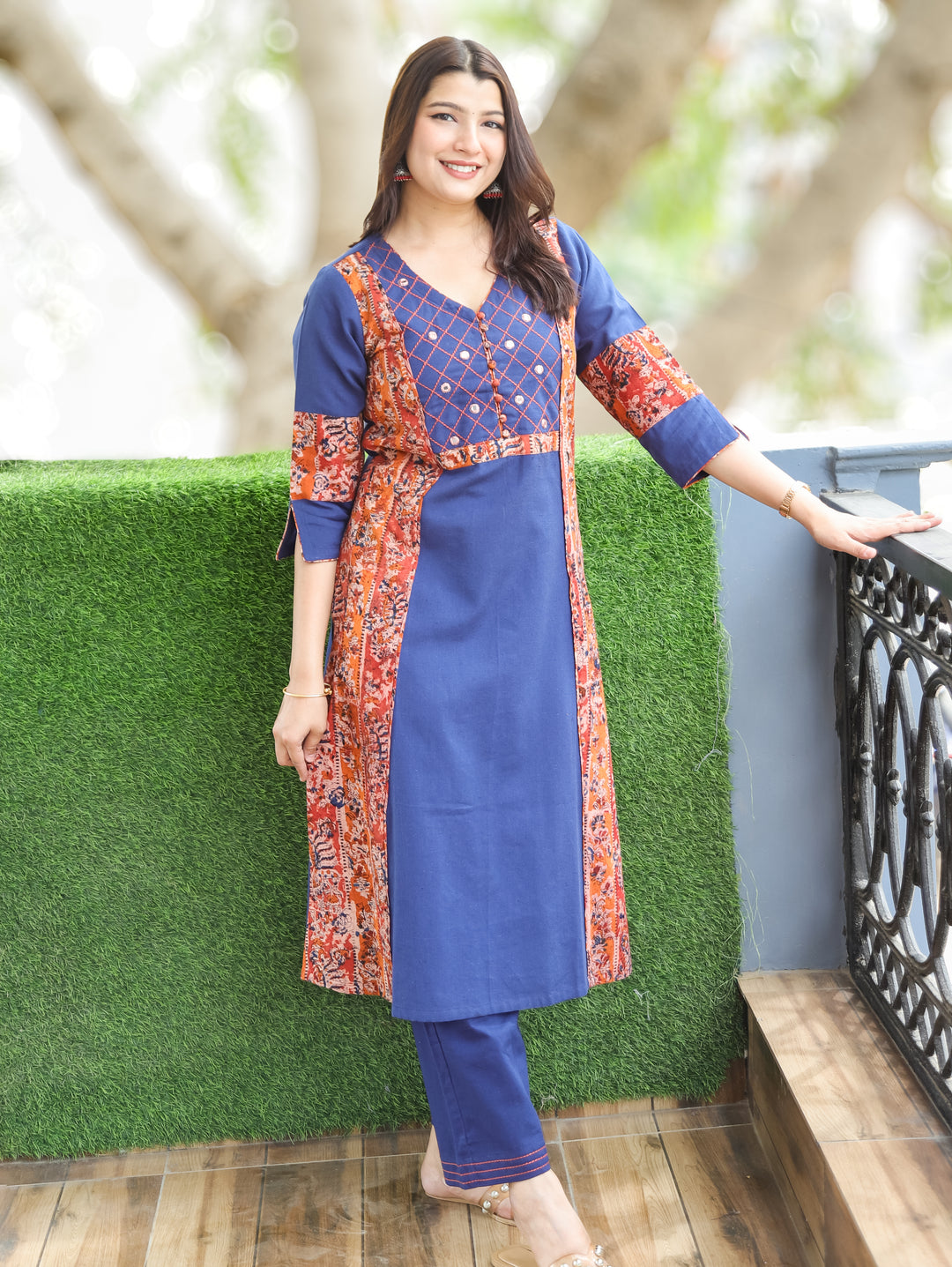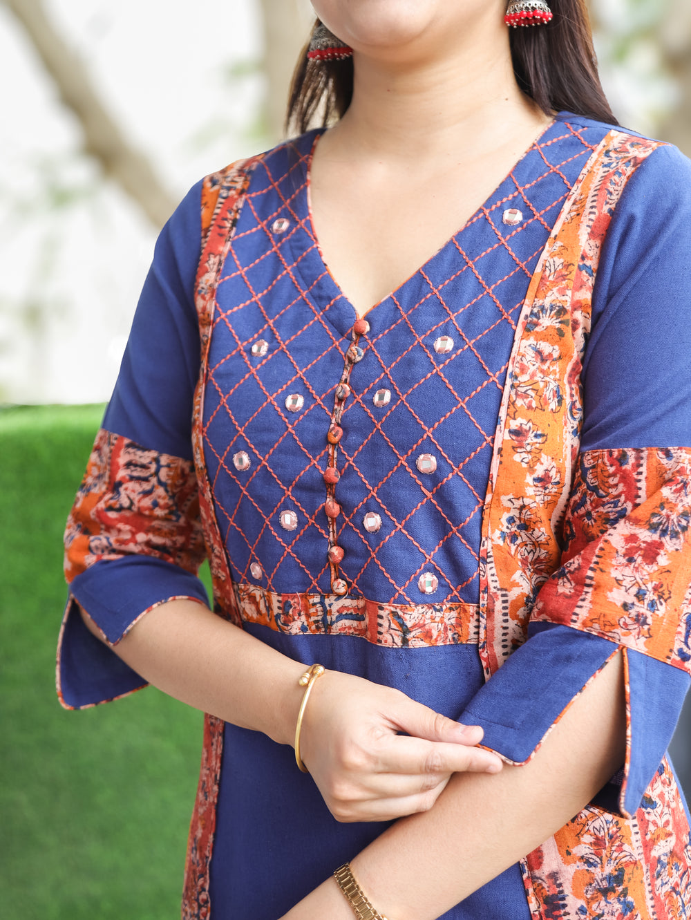 Ruhaniyaat Indigo Blue Dabu Print Mirror Kutch Work Cotton Kurti-D1