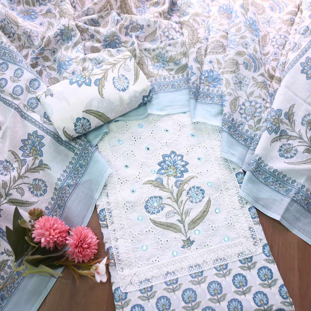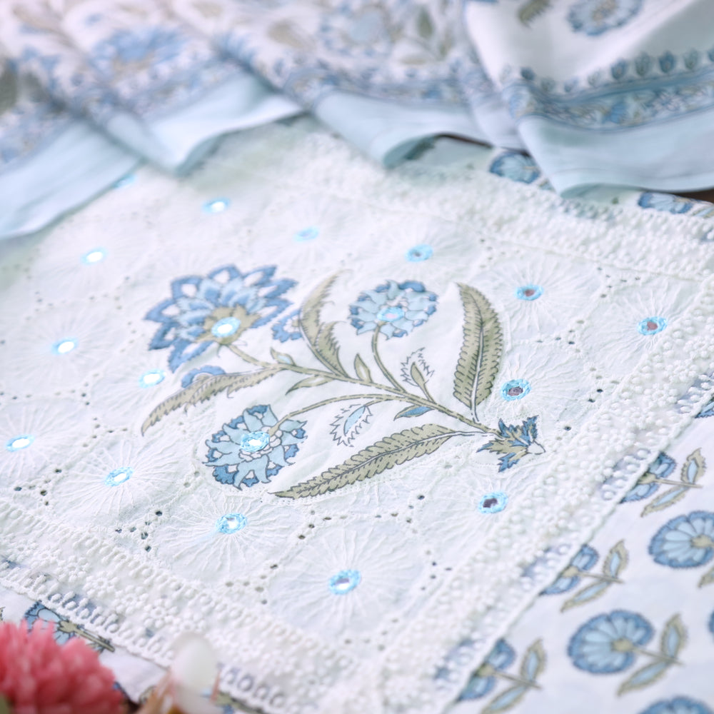 Meenakshi Indigo Blue Kutch Mirror Patch Work Dabu Printed Cotton Suit Set D3