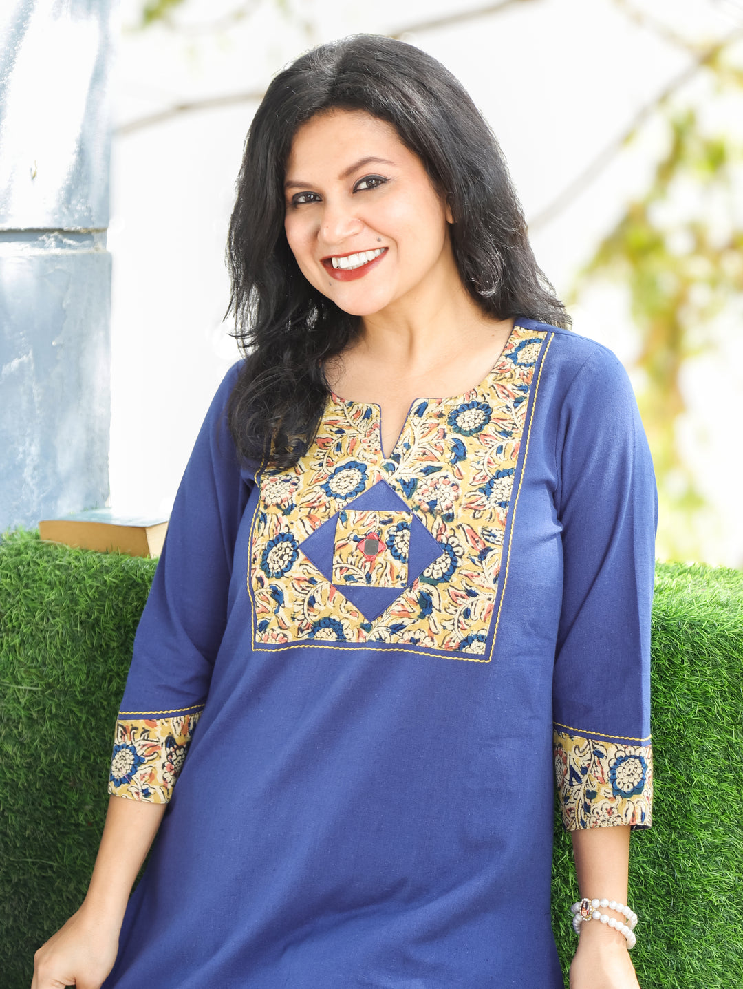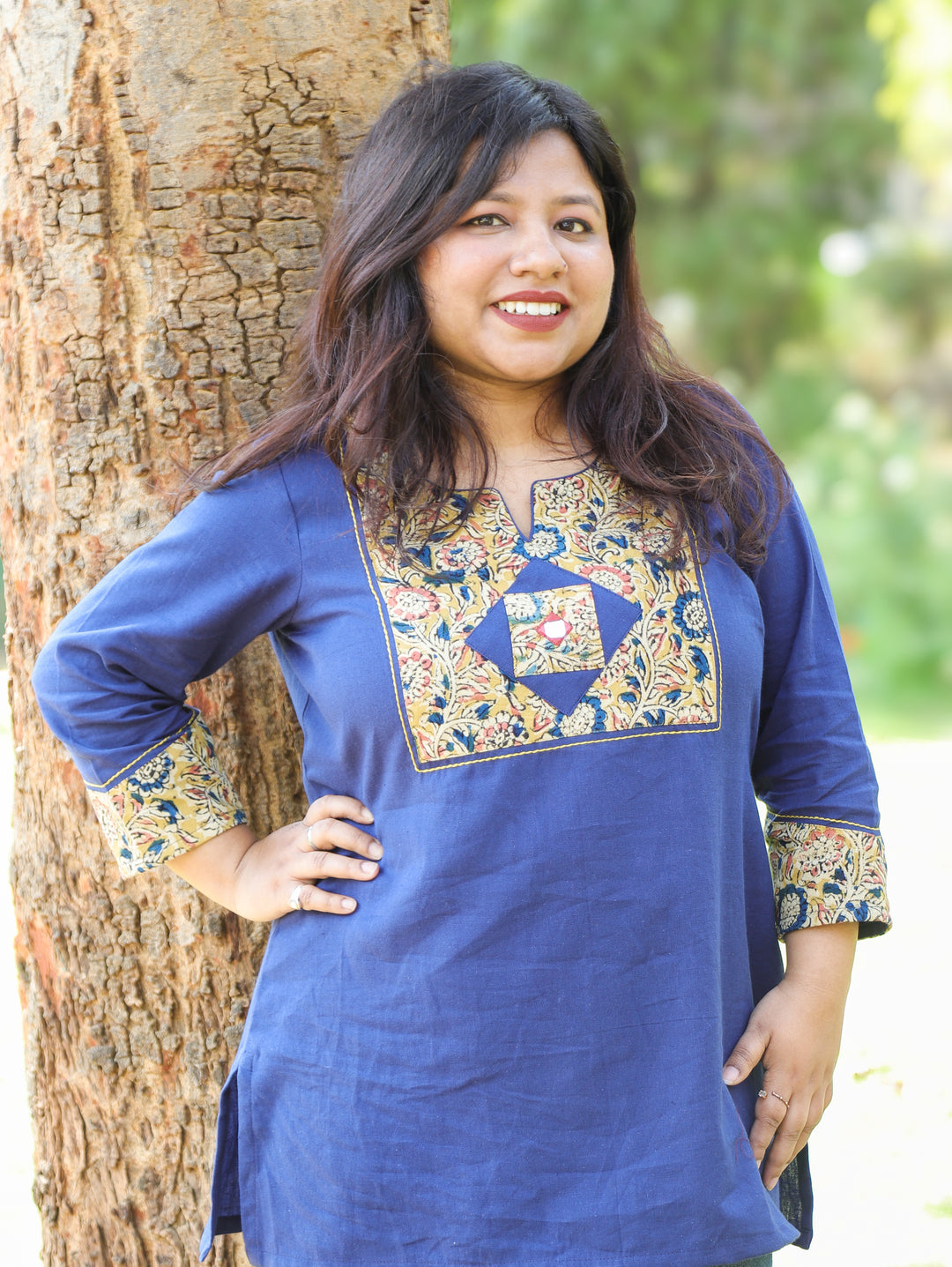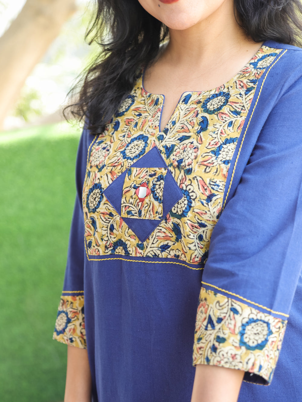 Kalmi Denim Blue with Kalamakri Patch with Mirror Work Short Cotton Kurti