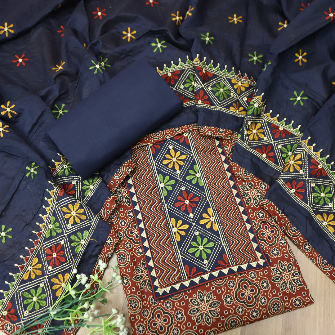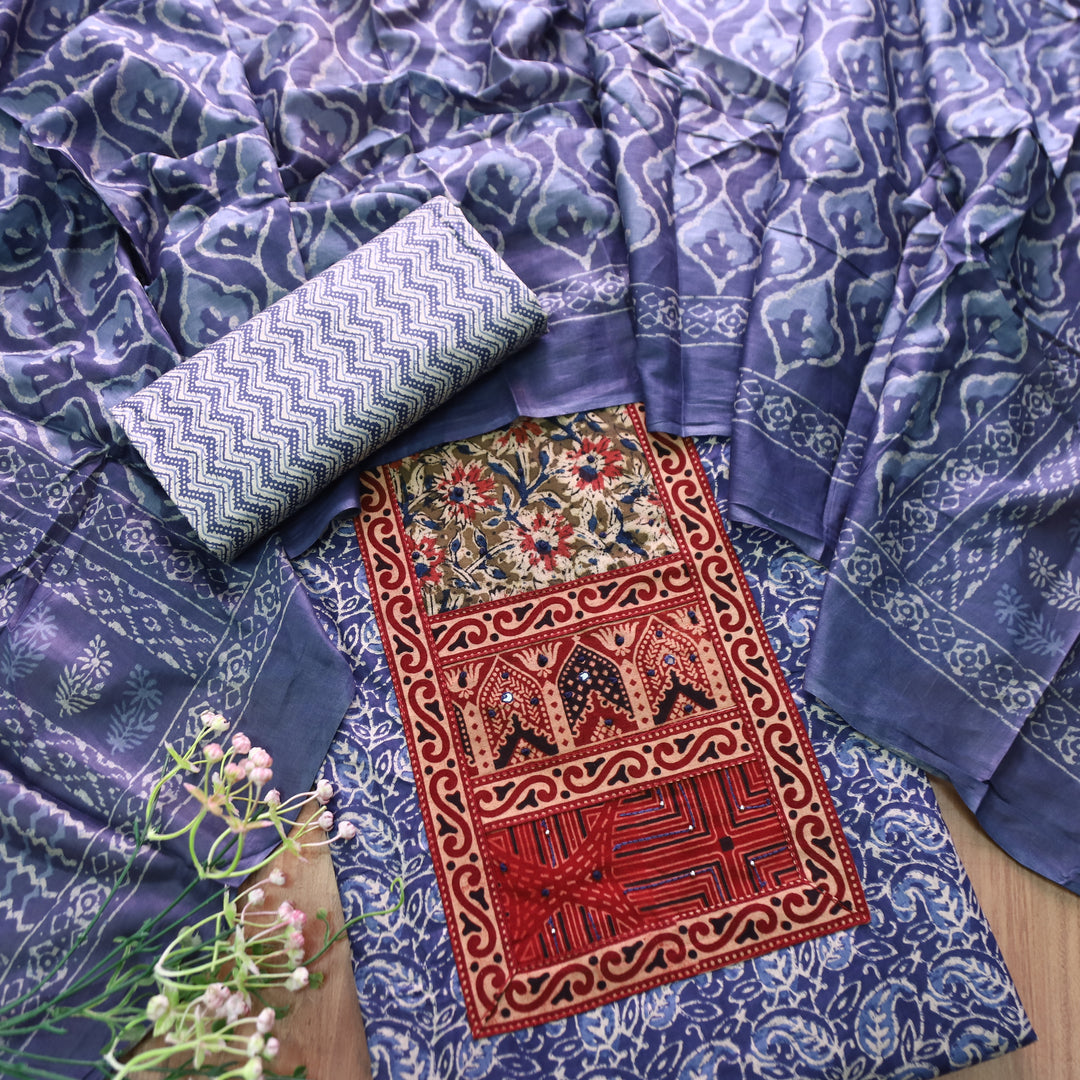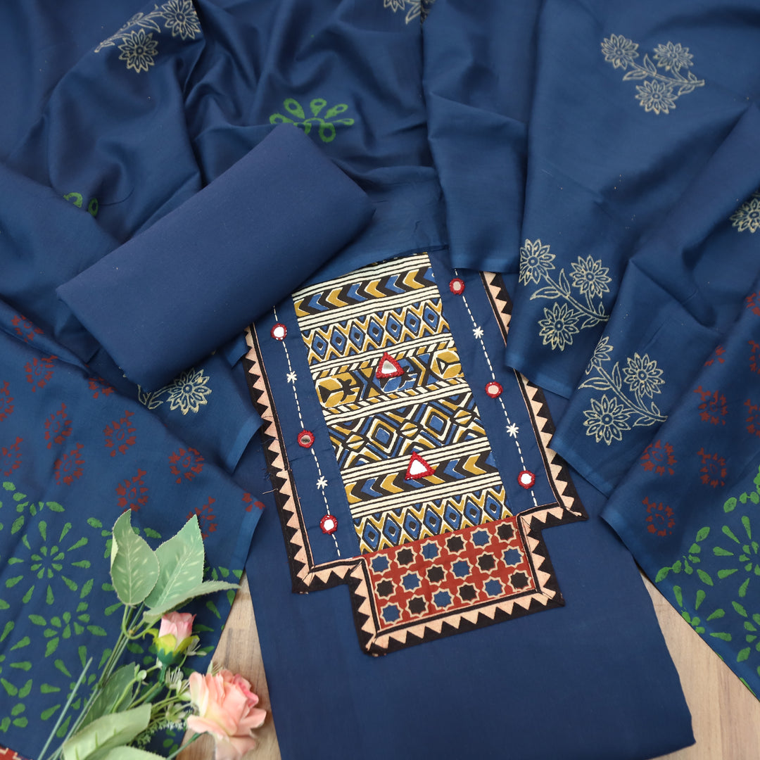 Jogiya Denim Blue Ajrak Printed Yoke with Mirror Work Cotton Suit Set