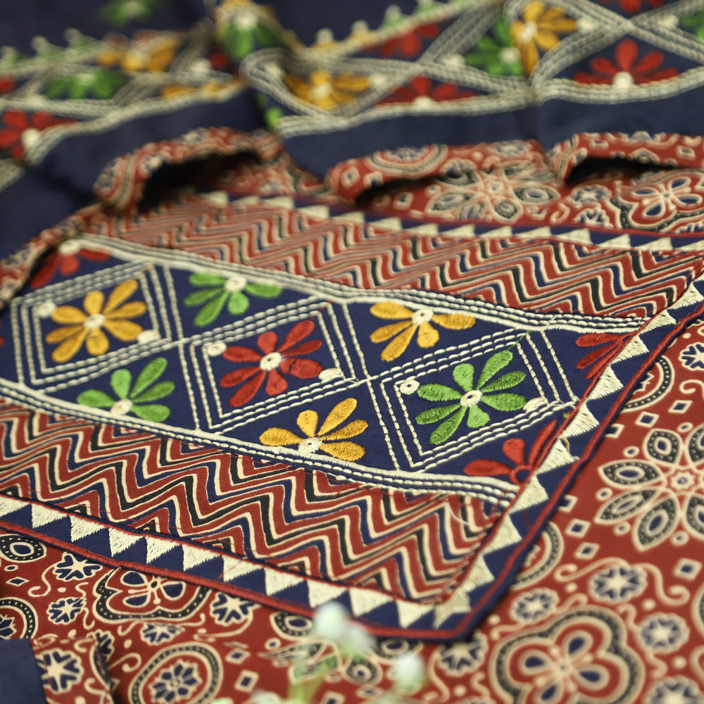 Maurya Maroon Red Embroidered Neck Yoke with Ajrak Print Cotton Set