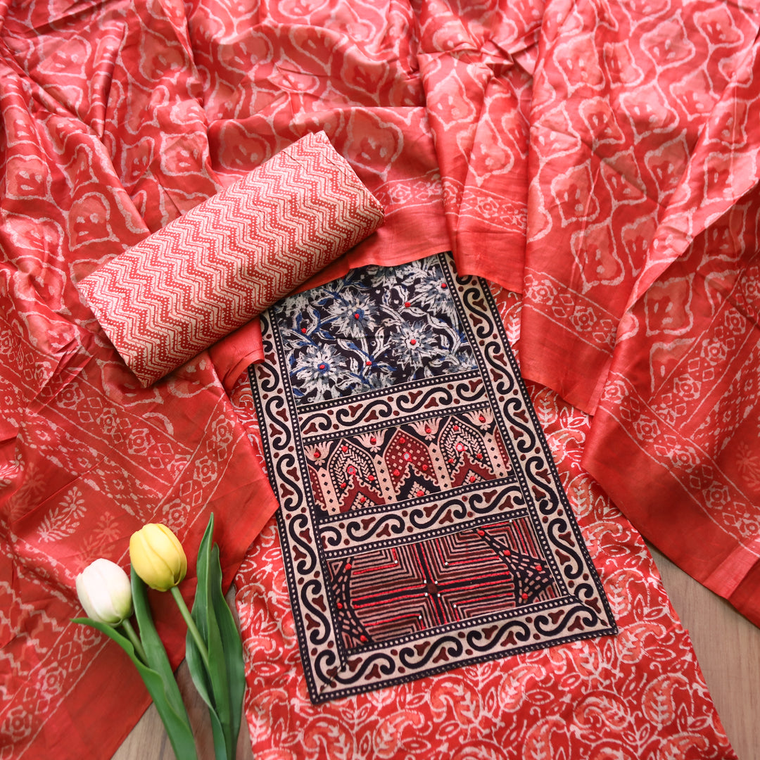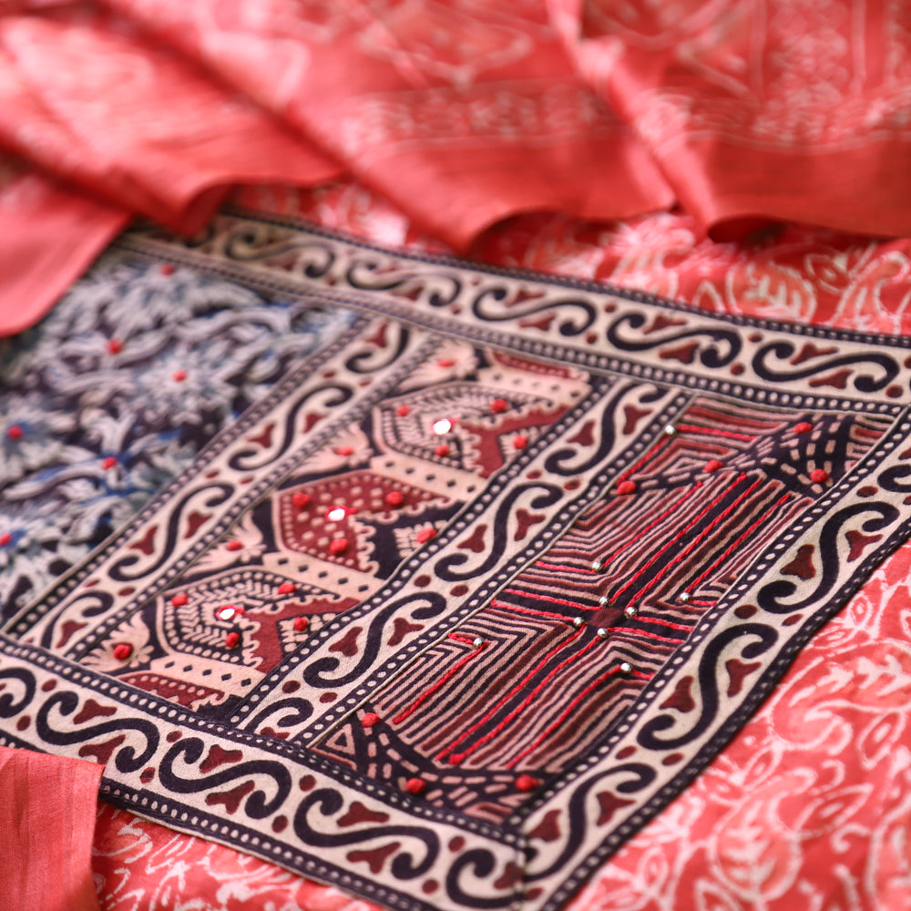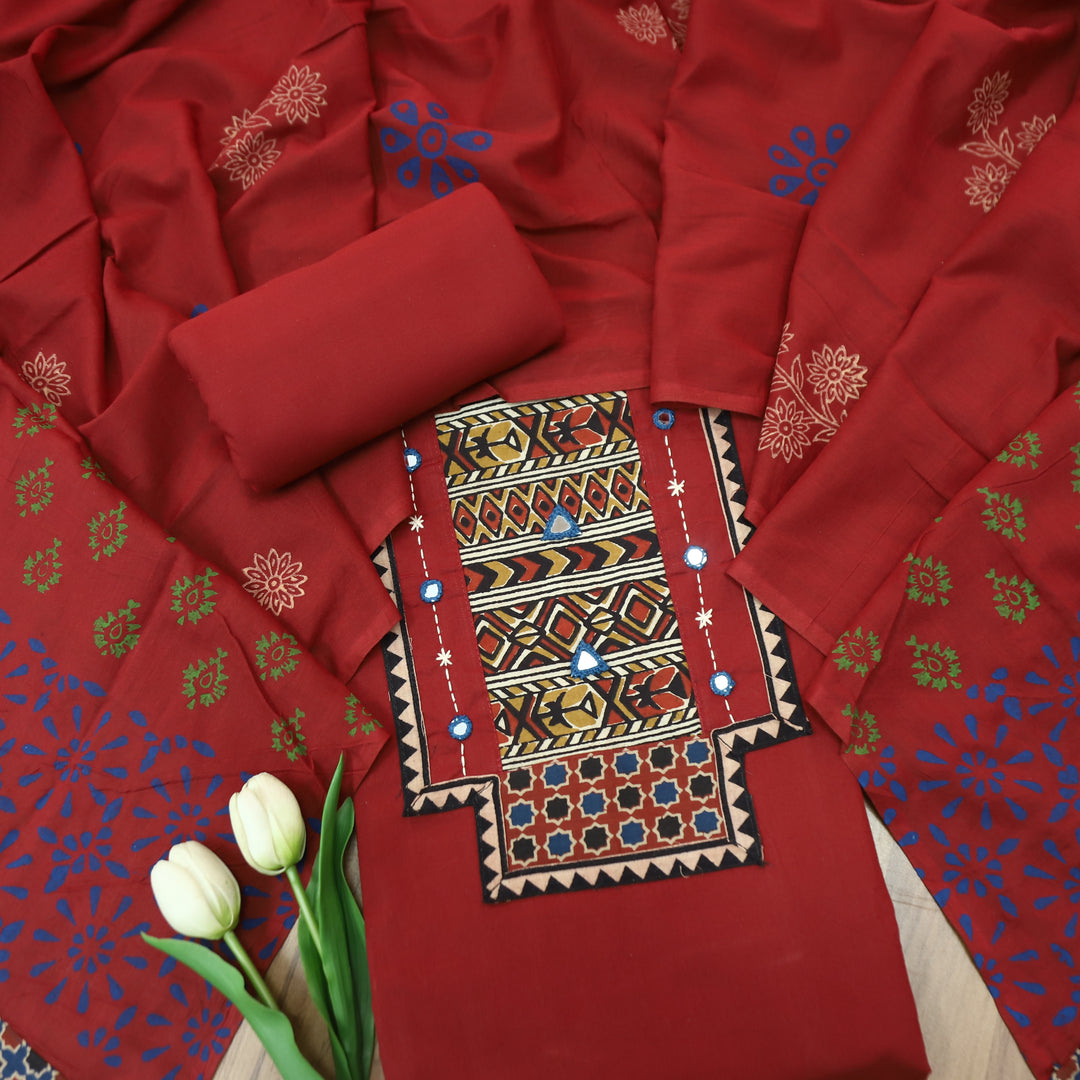 Jogiya Cherry Red Ajrak Printed Yoke with Mirror Work Cotton Suit Set