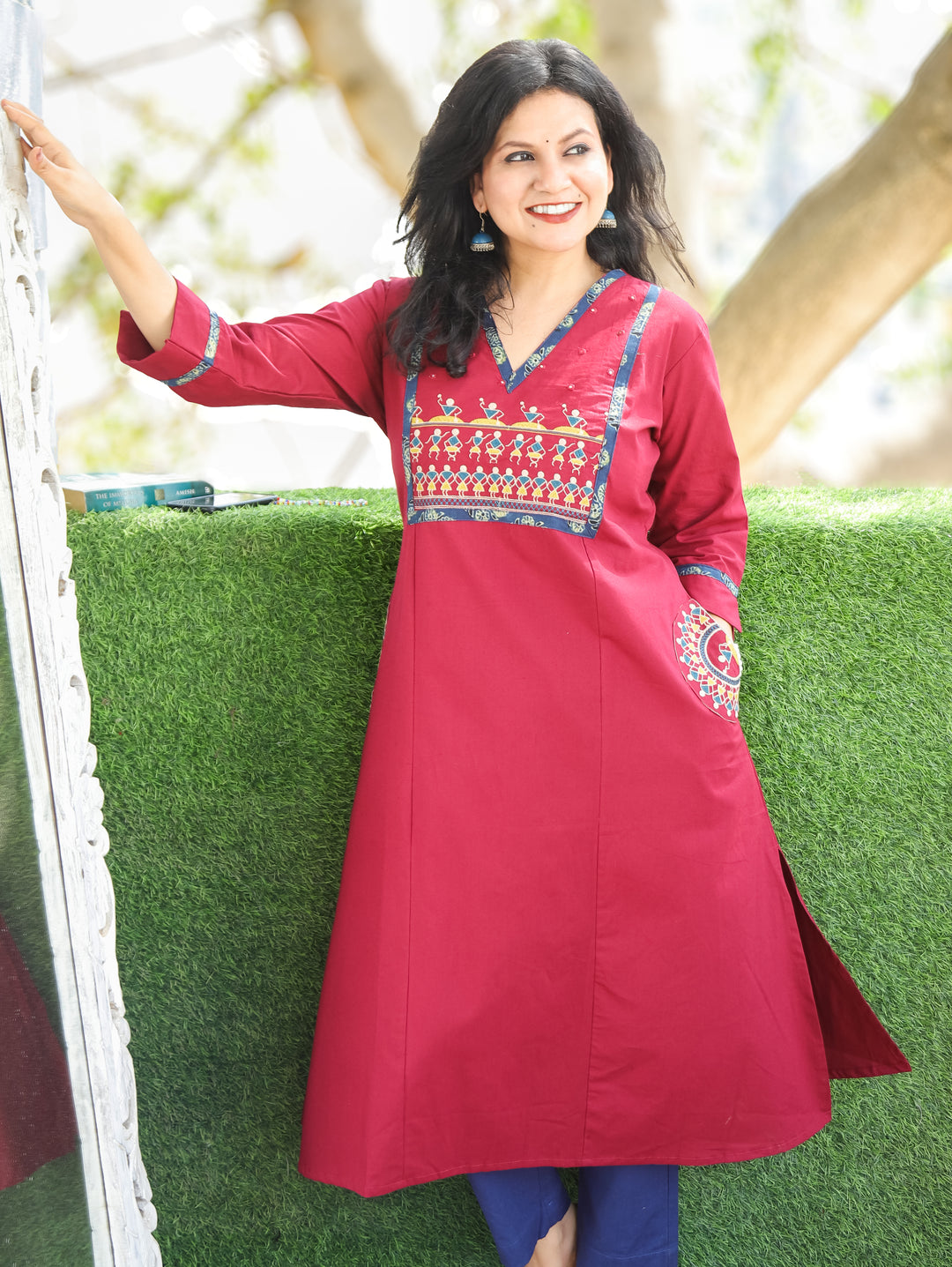 Kishori Cerulean Teal Warli Embroidered Yoke Cotton Kurti with Embroidered Side Pocket