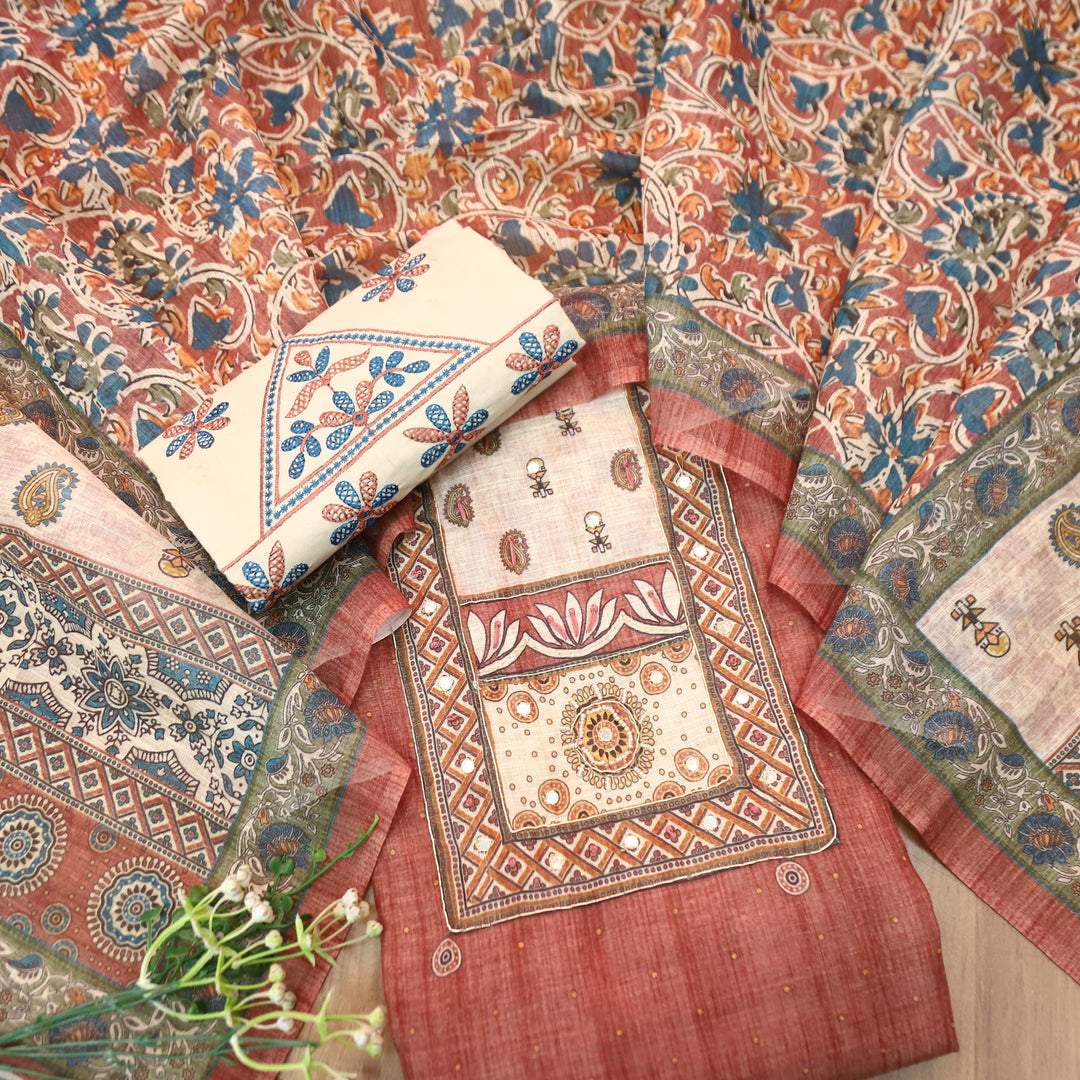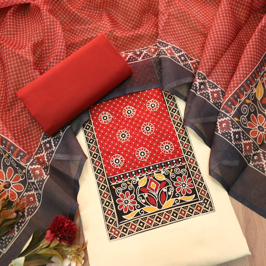 Shanvi Beige with Red Kutch Embroidered with Patra Work CottonSuit Set