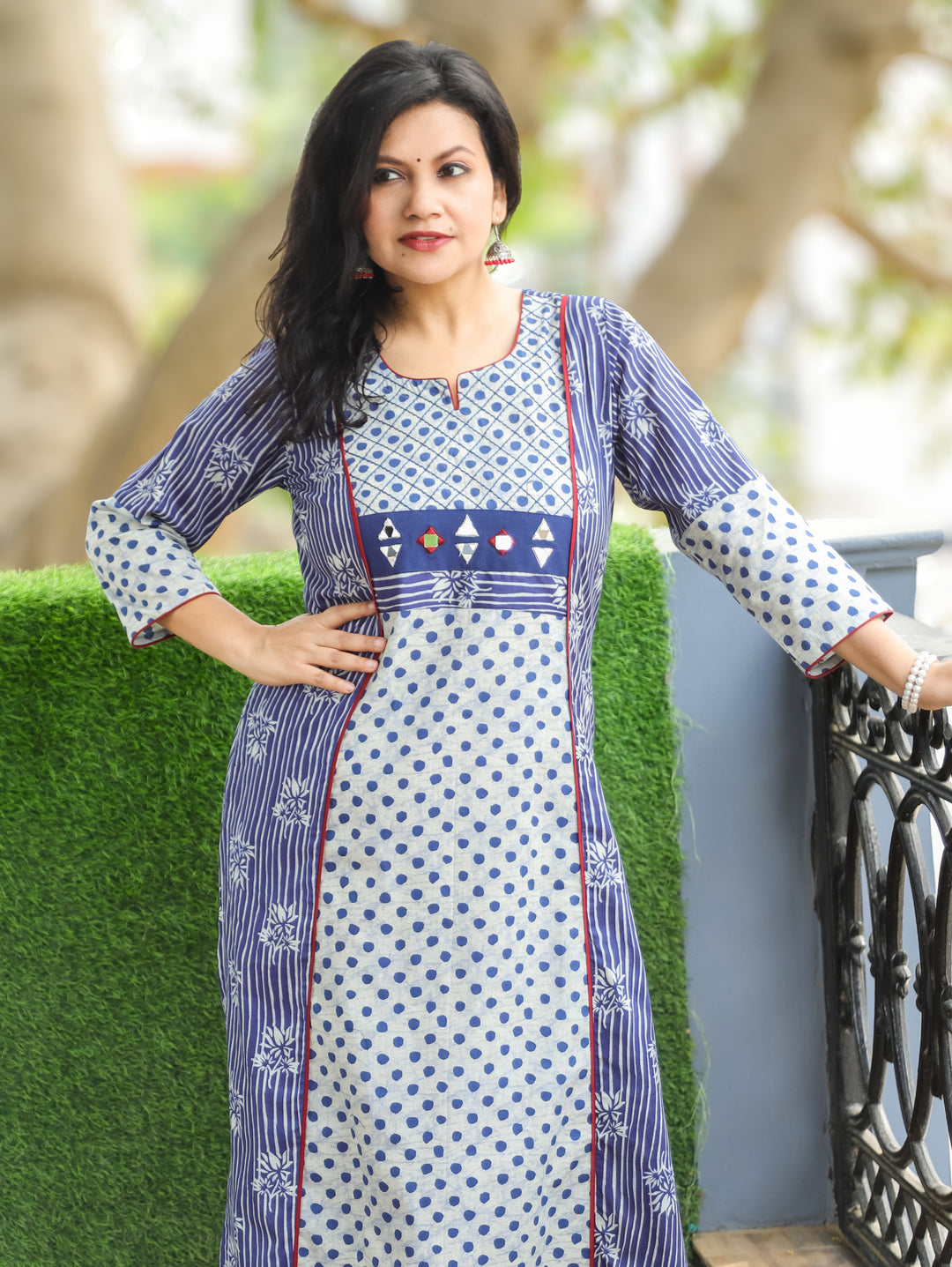Mehram Indigo Blue Dabu Panel A-Line Cotton Kurti