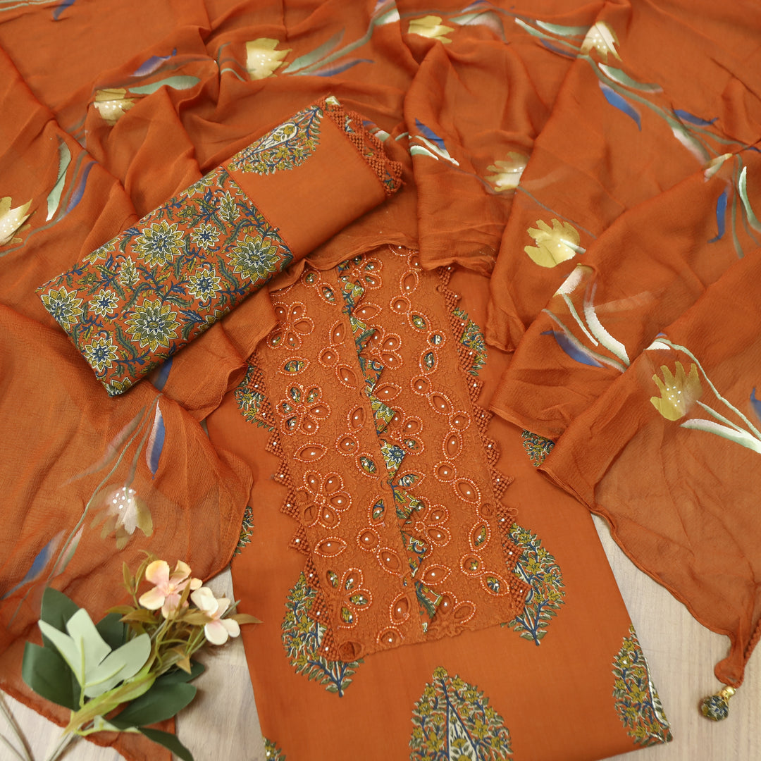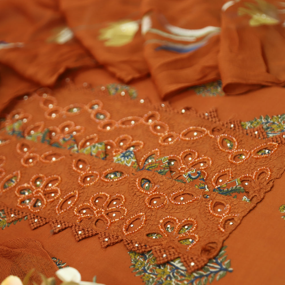 Bloom Rust Orange Kardana Yoke Work Floral Printed Cotton Set