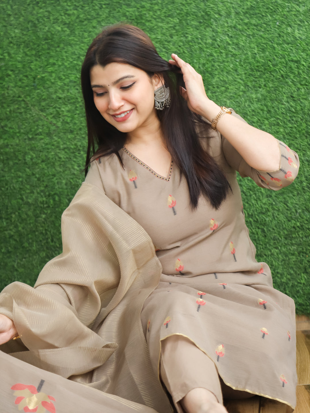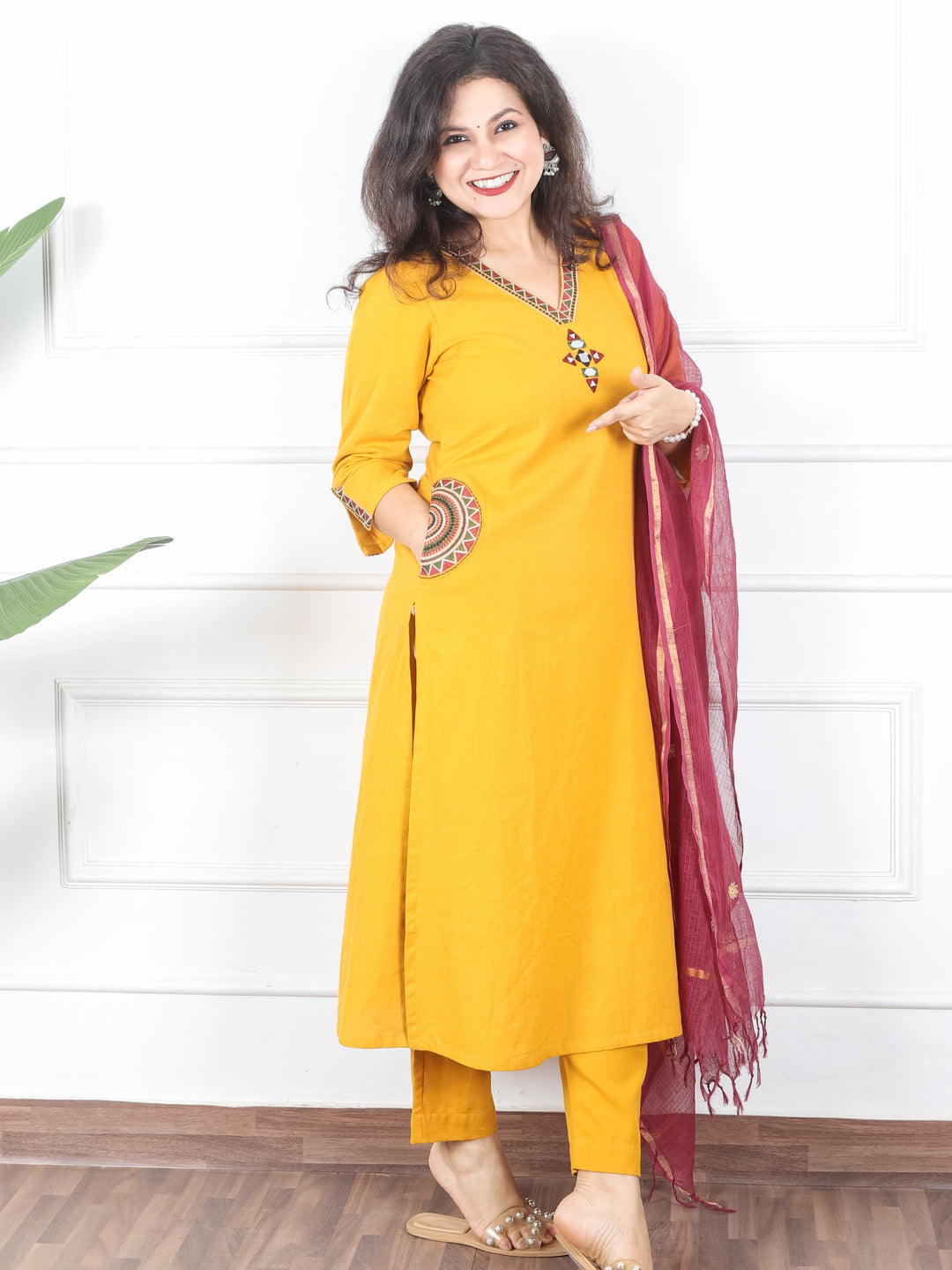 Ruhaniyaat Latte Beige Mirror with Kutch Fusion Work Cotton Kurti-D1