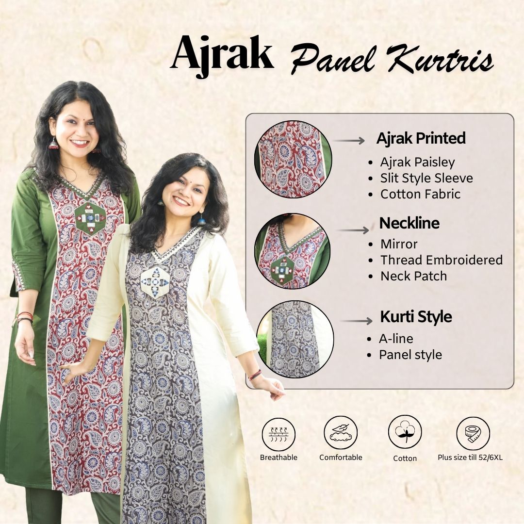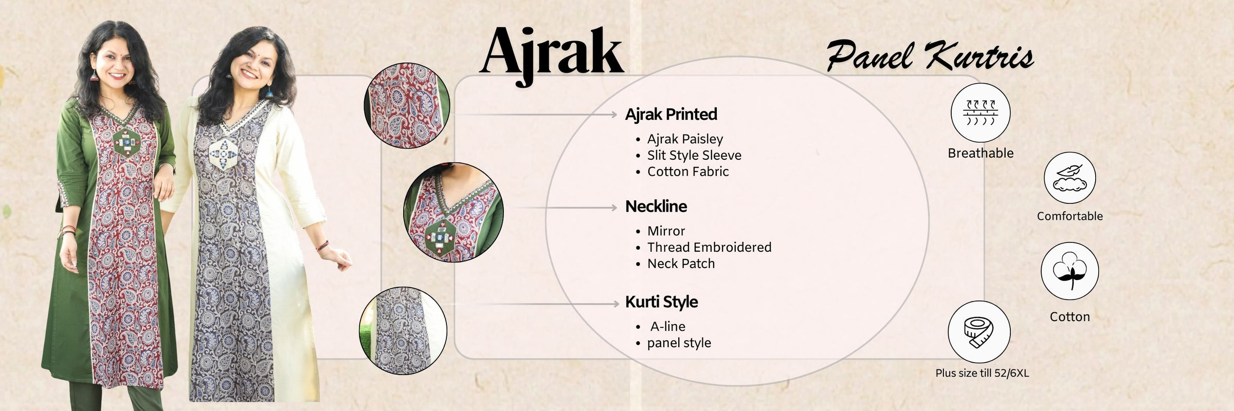 Shaniya Beige with Black Ajrak with Elephant Print Mirror Work Cotton Kurti