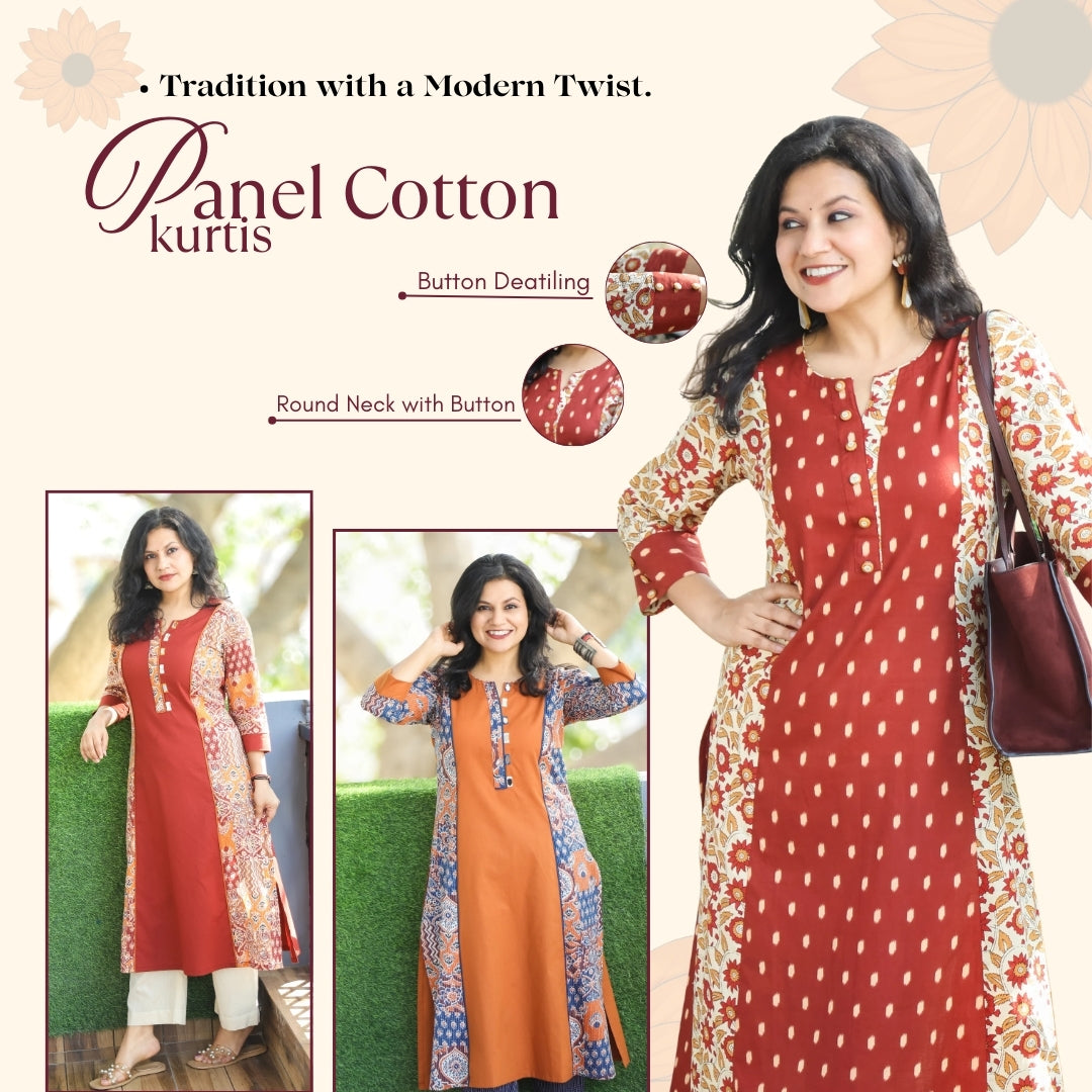 Khushi Choco Brown Button Work Round Neck Floral Printed Panel Cotton Kurti