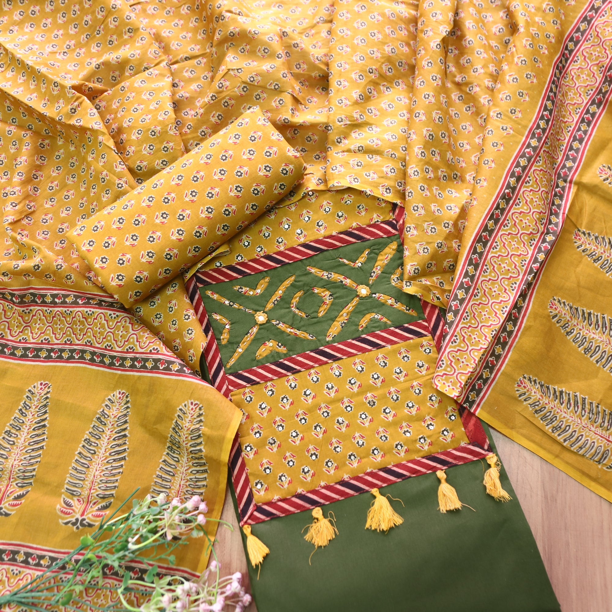 Raashi Cherry Red Applique Patch Yoke Cotton Suit Set