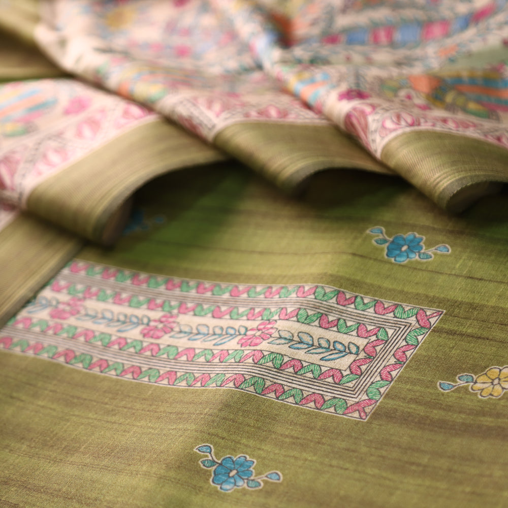 Ashwani Grass Green Madhubai Print Neck and Hemline Art Silk Tussar Set
