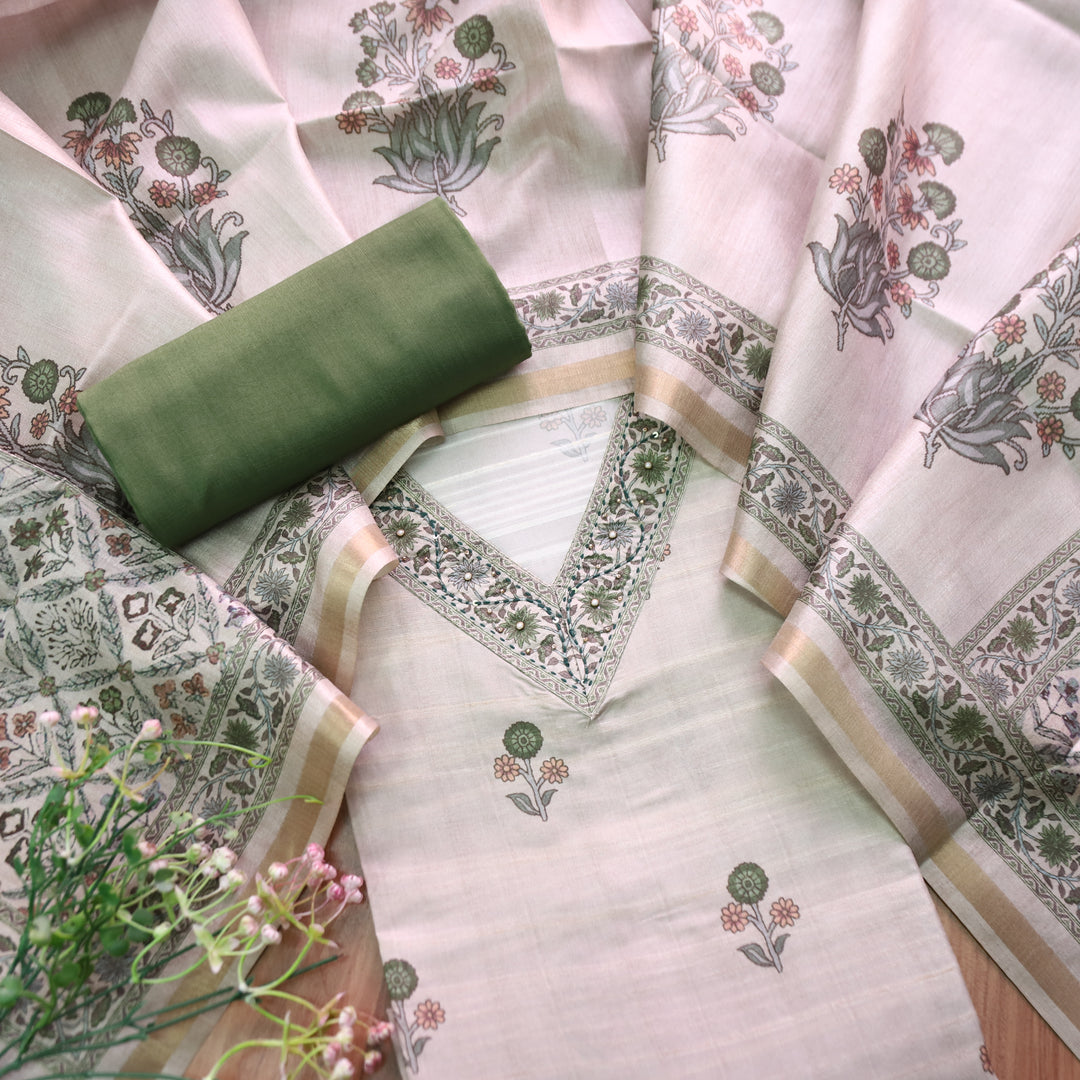 Faraana Beige with Green Floral Print and Moti V Neck Tussar Chanderi Silk Set