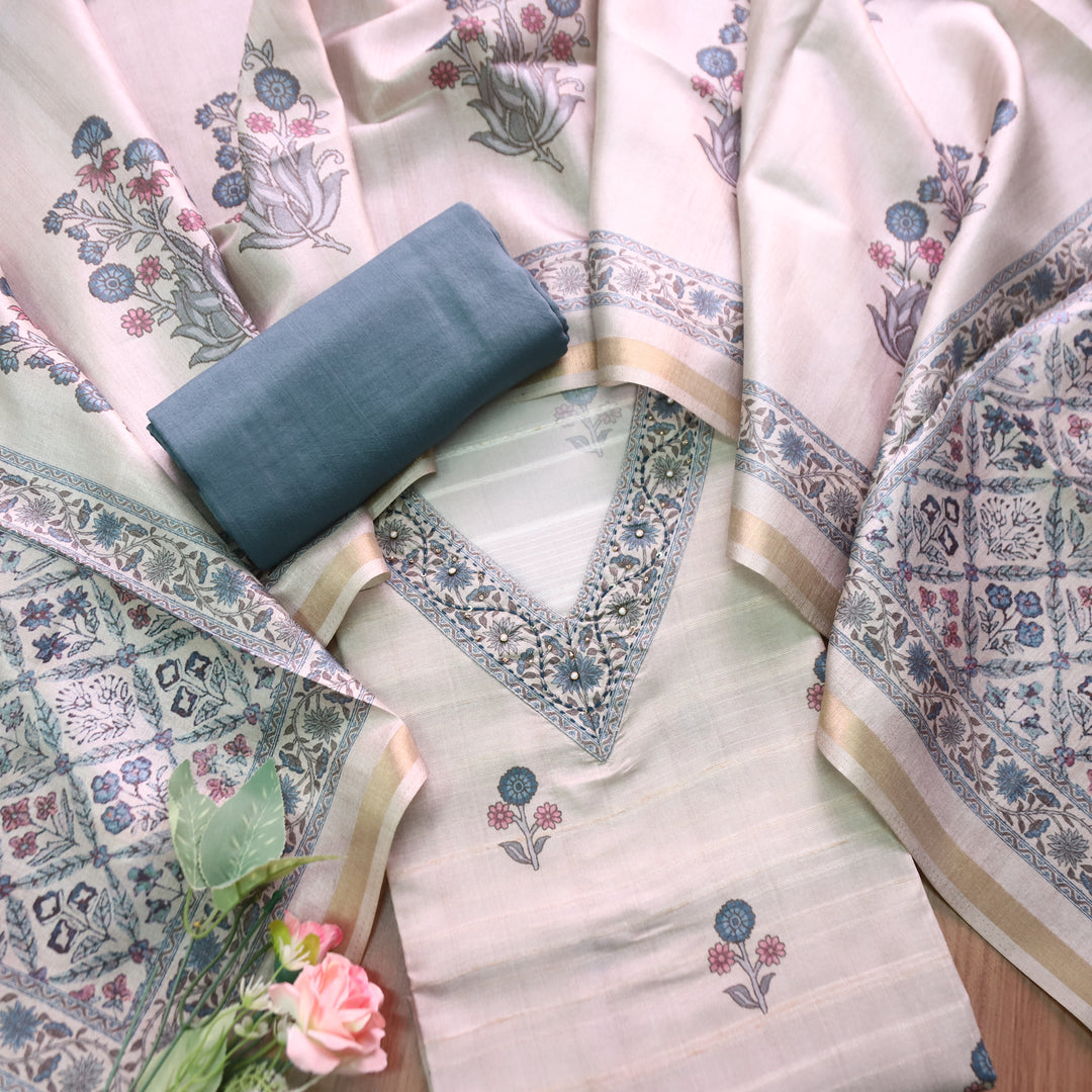Faraana Beige with Teal Floral Print and Moti V Neck Tussar Chanderi Silk Set