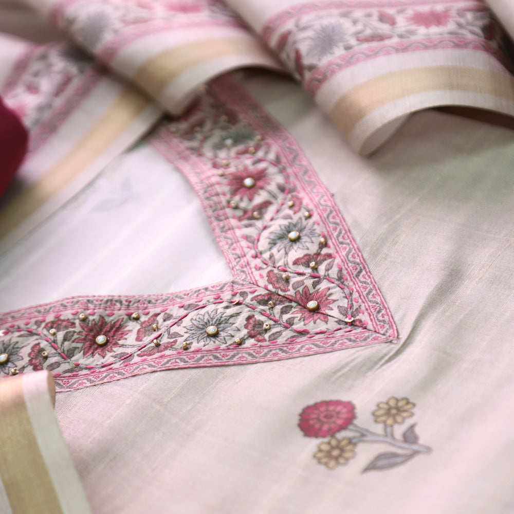 Faraana Beige with Pink Floral Print and Moti V Neck Tussar Chanderi Silk Set