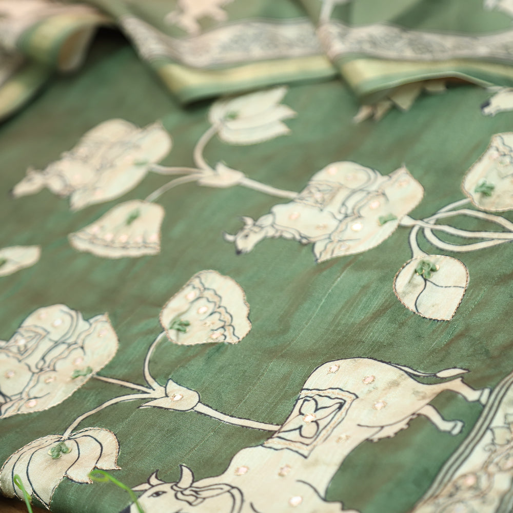 Saatvi Sage Green Pichwai Print with Zari Patra Work Tussar Chanderi Silk Set