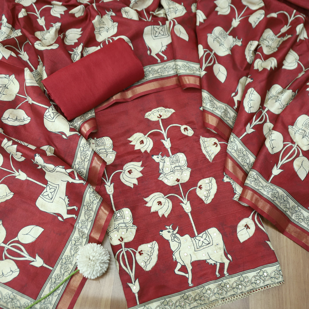 Saatvi Cherry Jam Red Pichwai Print with Zari Patra Work Tussar Chanderi Silk Set