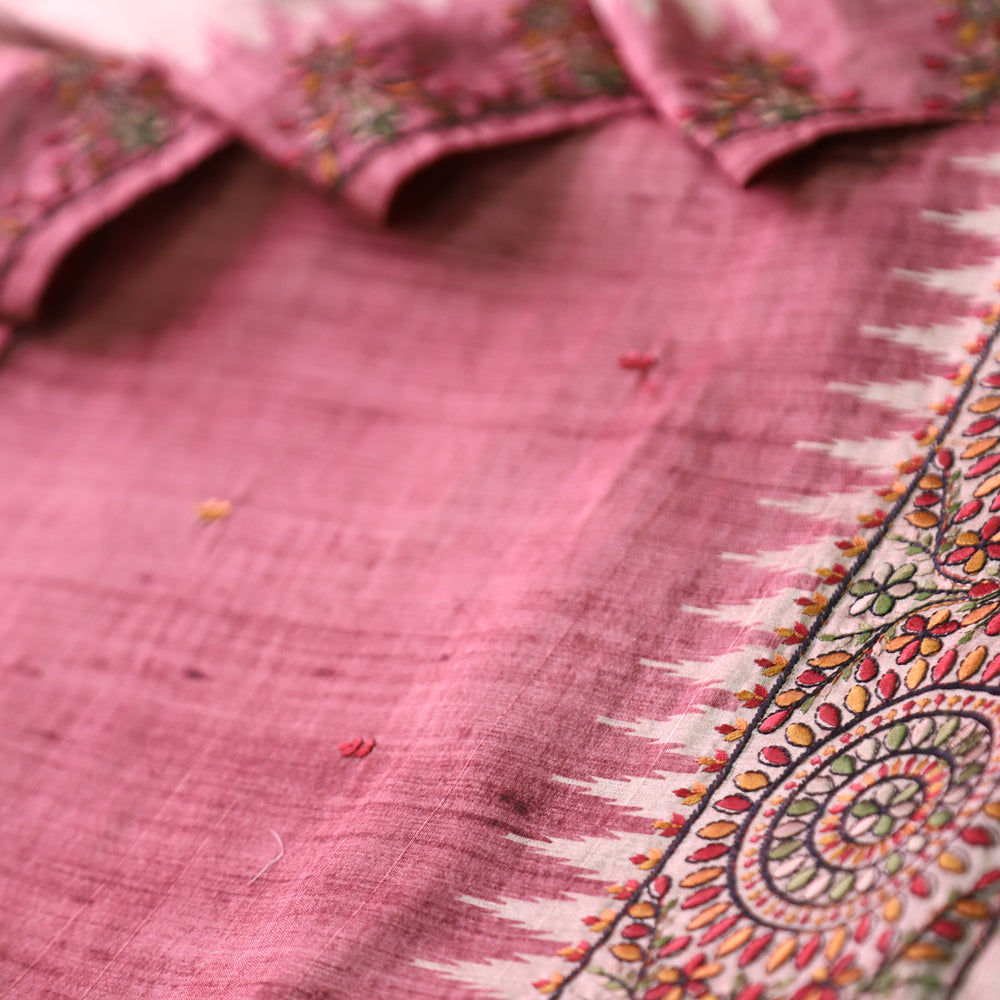 Ashwani Coral Blush Madhubai Print Neck and Hemline Art Silk Tussar Set