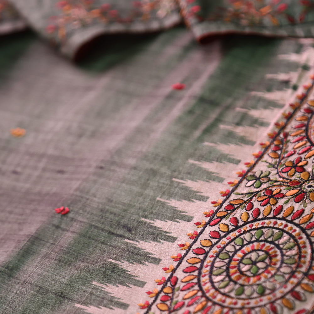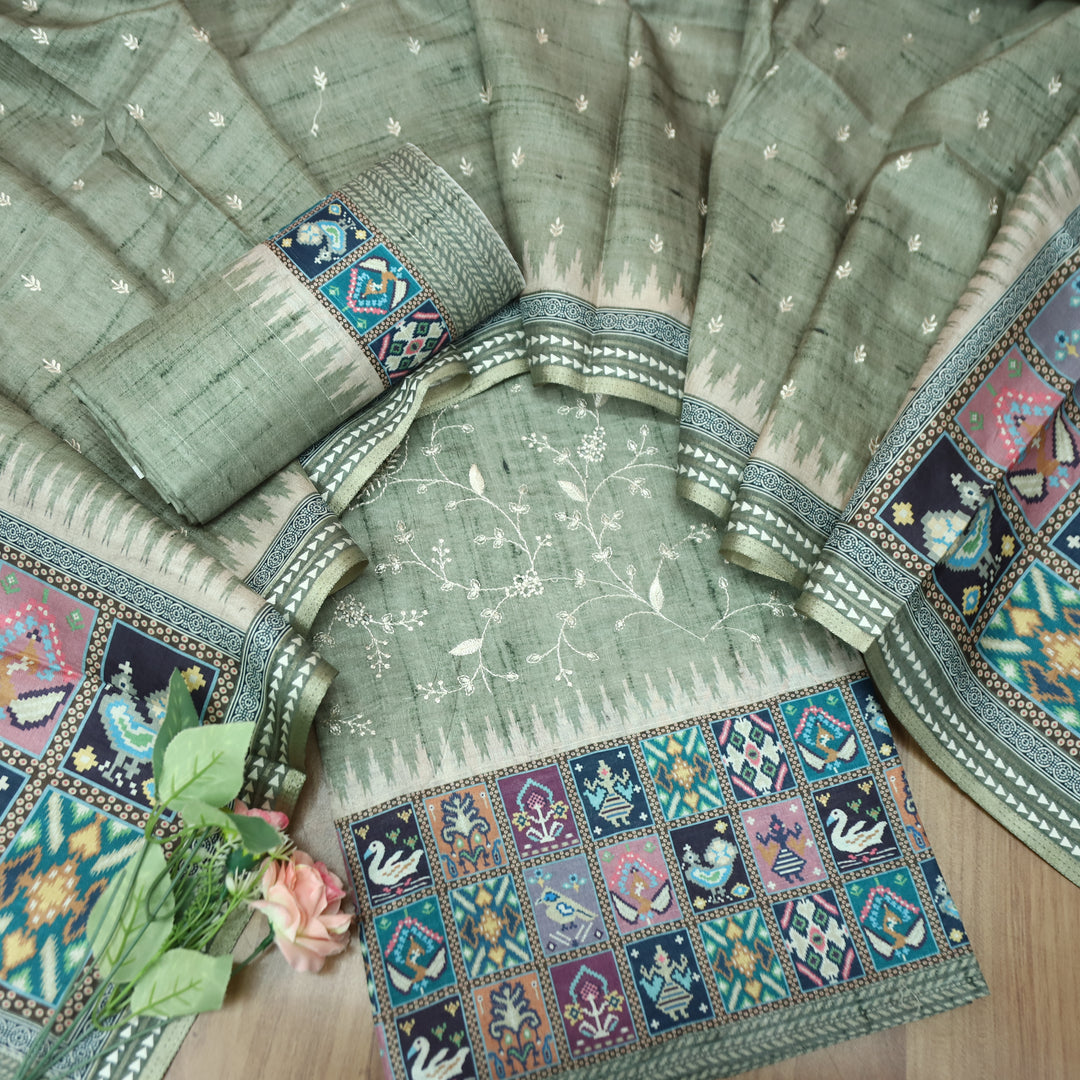 Rishika Sage Green Schiffli with Thread Work Printed Hem Tussar Chanderi Silk Set
