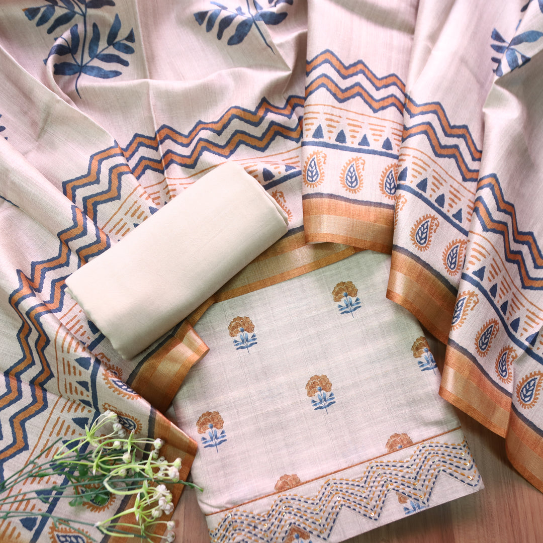 Rishika Peanut Beige Schiffli with Thread Work Printed Hem Tussar Chanderi Silk Set