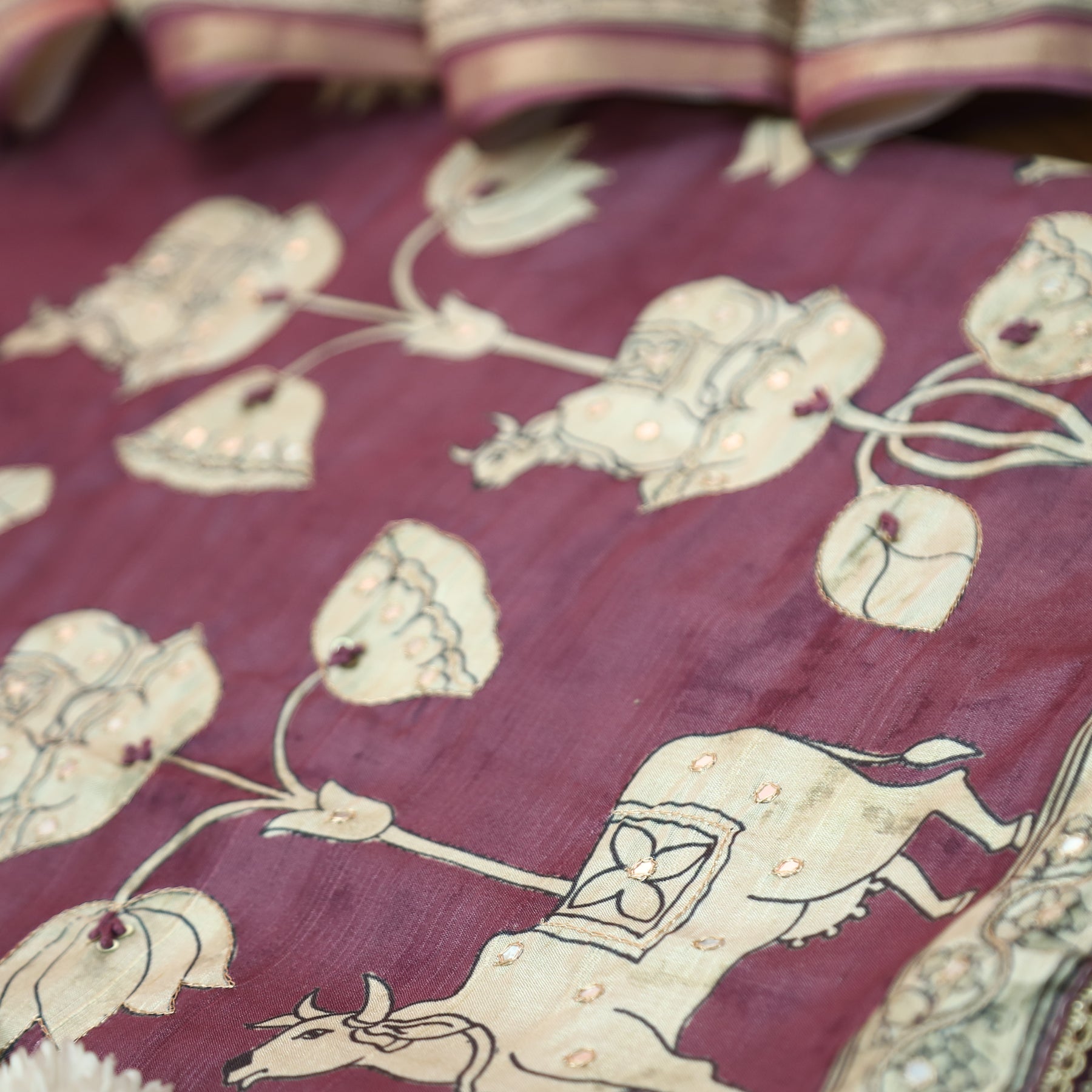 Saatvi Onion Purple Pichwai Print with Zari Patra Work Tussar Chanderi Silk Set