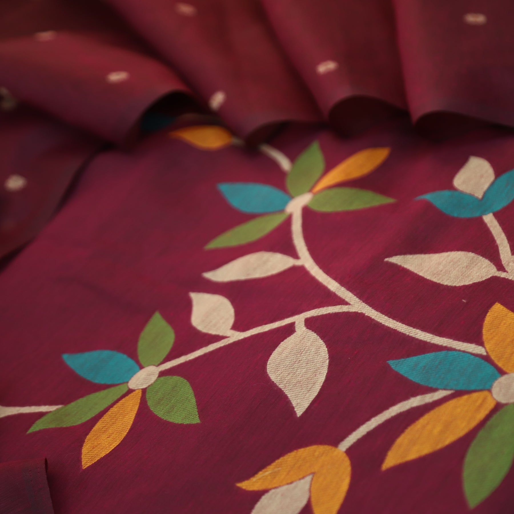 Vishakha Burgundy Wine All Over Authentic Jamdani Weaved Hem Chanderi Suit Set