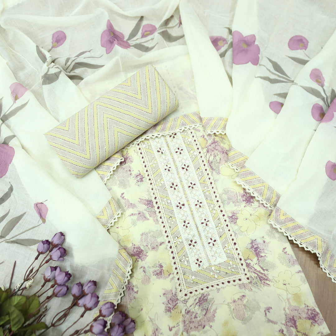 Suroor Beige With Purple Embellished Lace Work Neck Floral Printed Cotton Suit Set