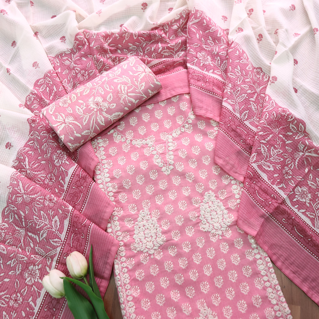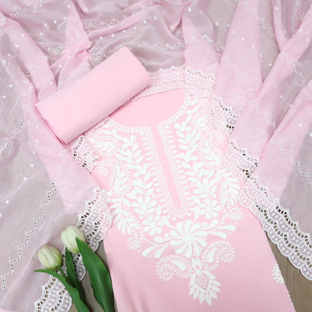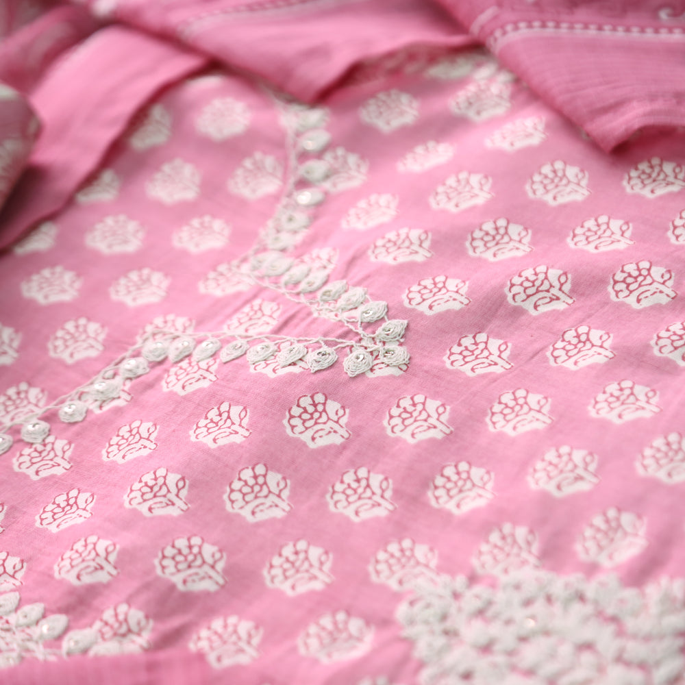 Apurav Soft Candy Pink Chikankari Inspired Neck Work Cotton Suit Set