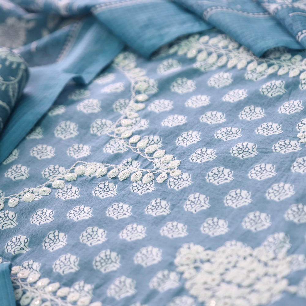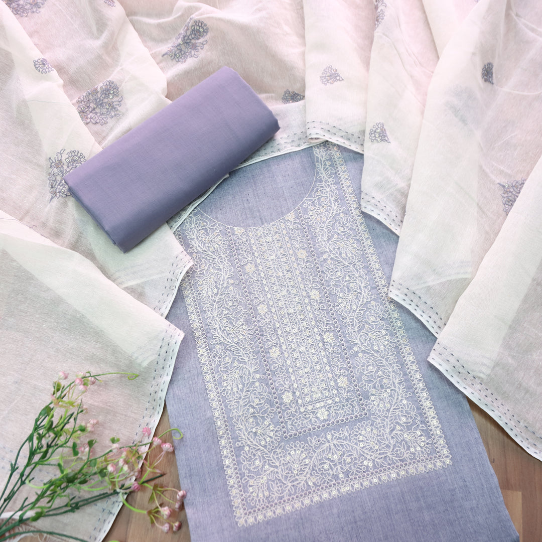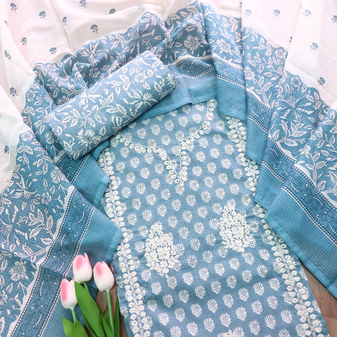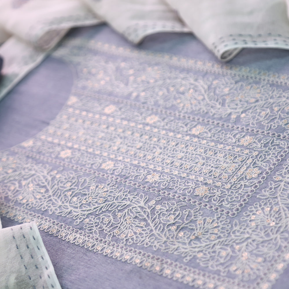 Nigahen Grayish Blue Thread Embroidered Neck Work Cotton Suit Set