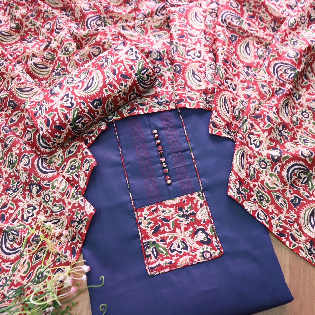 Radhika Indigo Blue Potli Button with Kalamakari Printed Neck Patch Cotton Suit Set