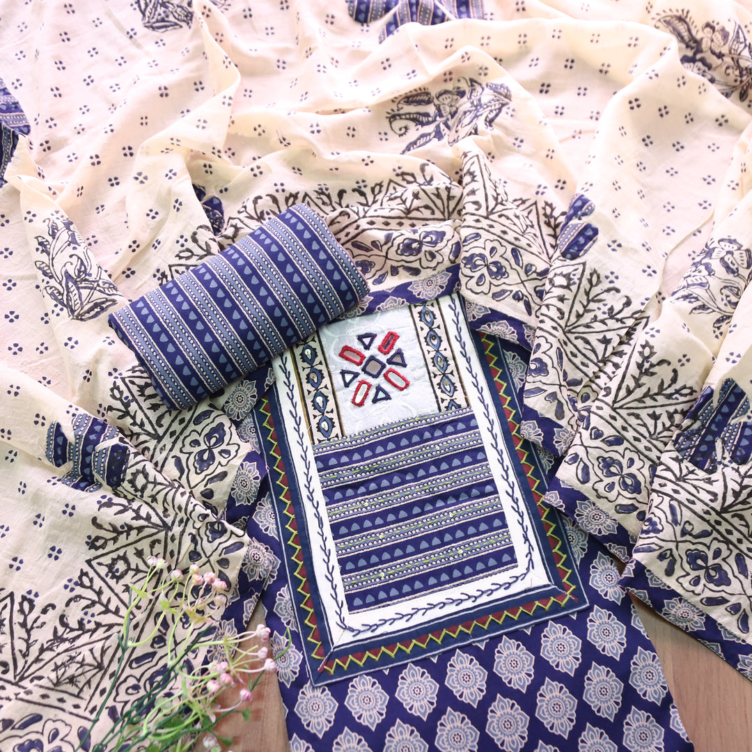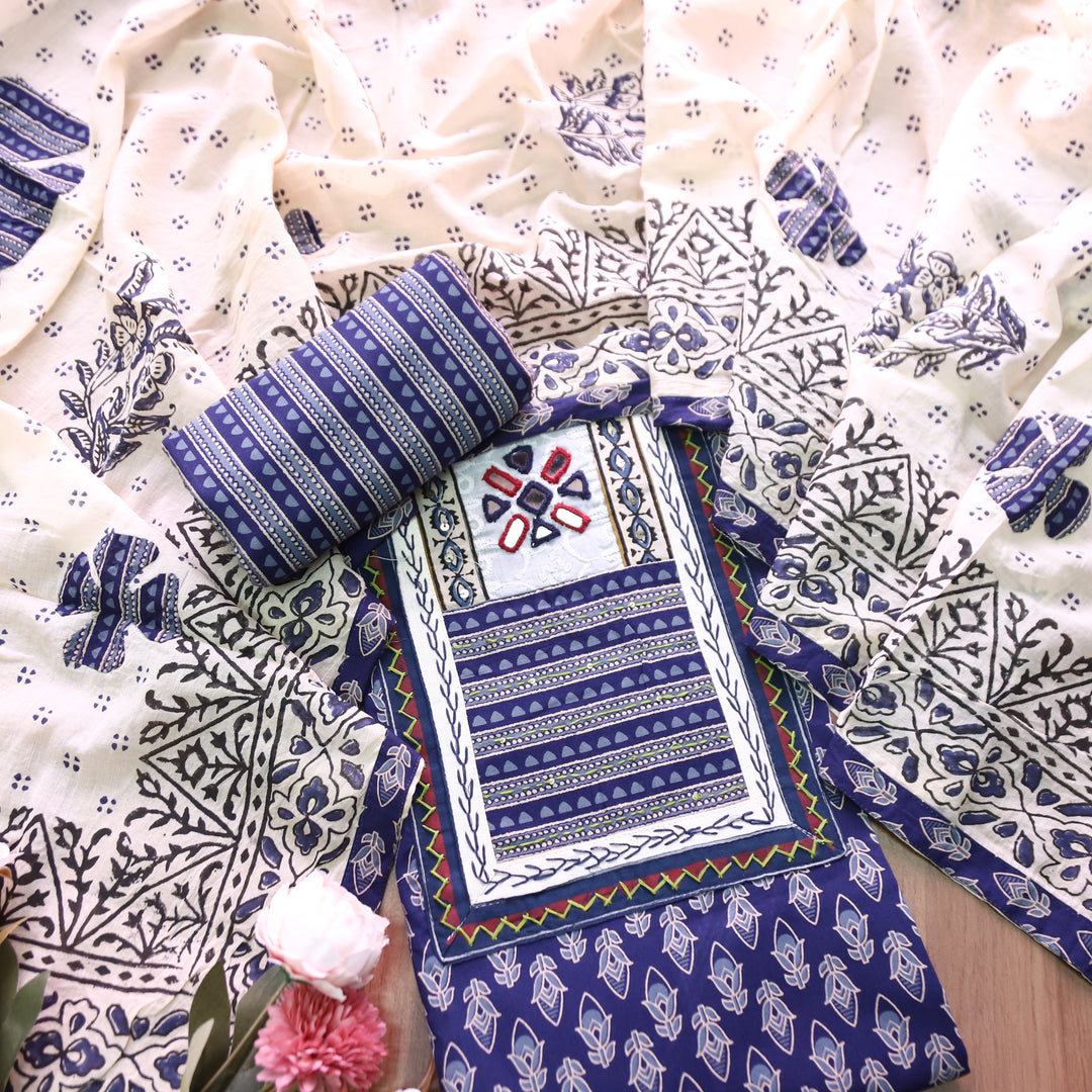 Udarri Indigo Blue Kutch Mirror Yoke in Dabu Floral Printed Cotton Suit Set D3