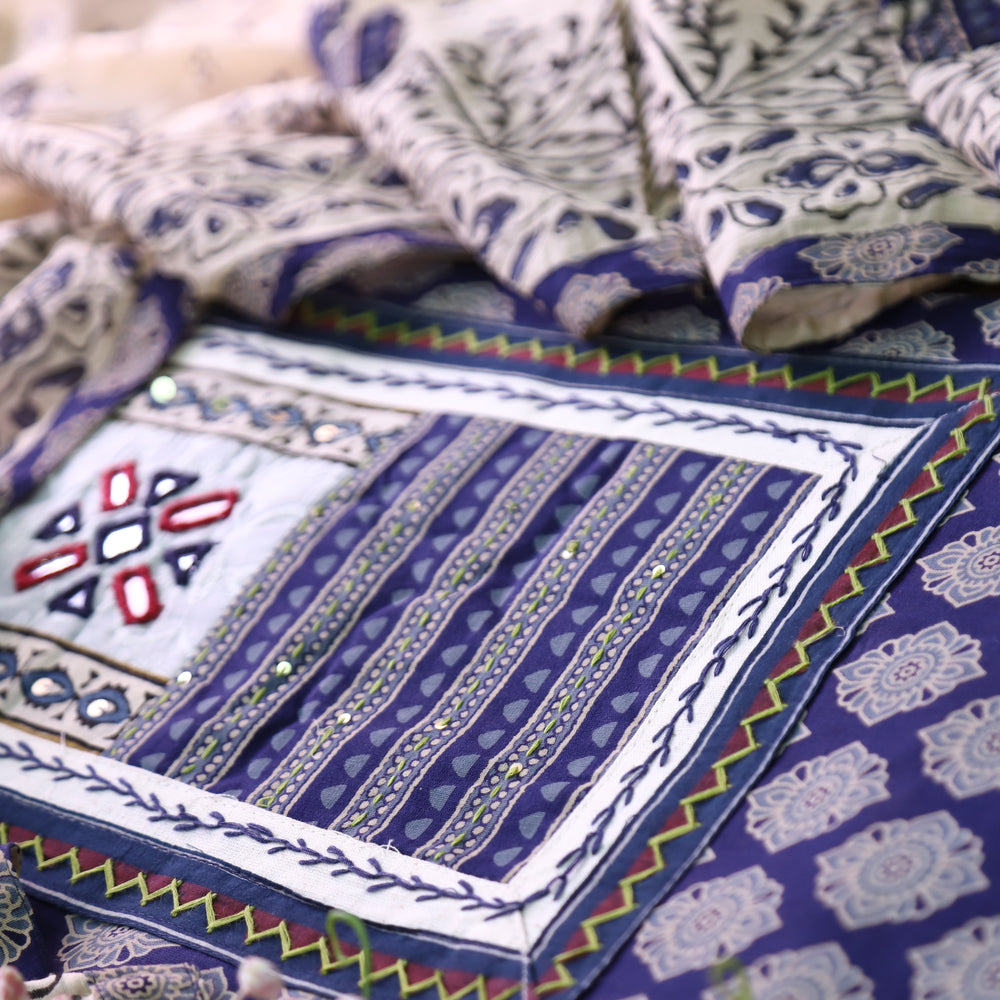 Udarri Indigo Blue Kutch Mirror Yoke in Dabu Floral Printed Cotton Suit Set D2