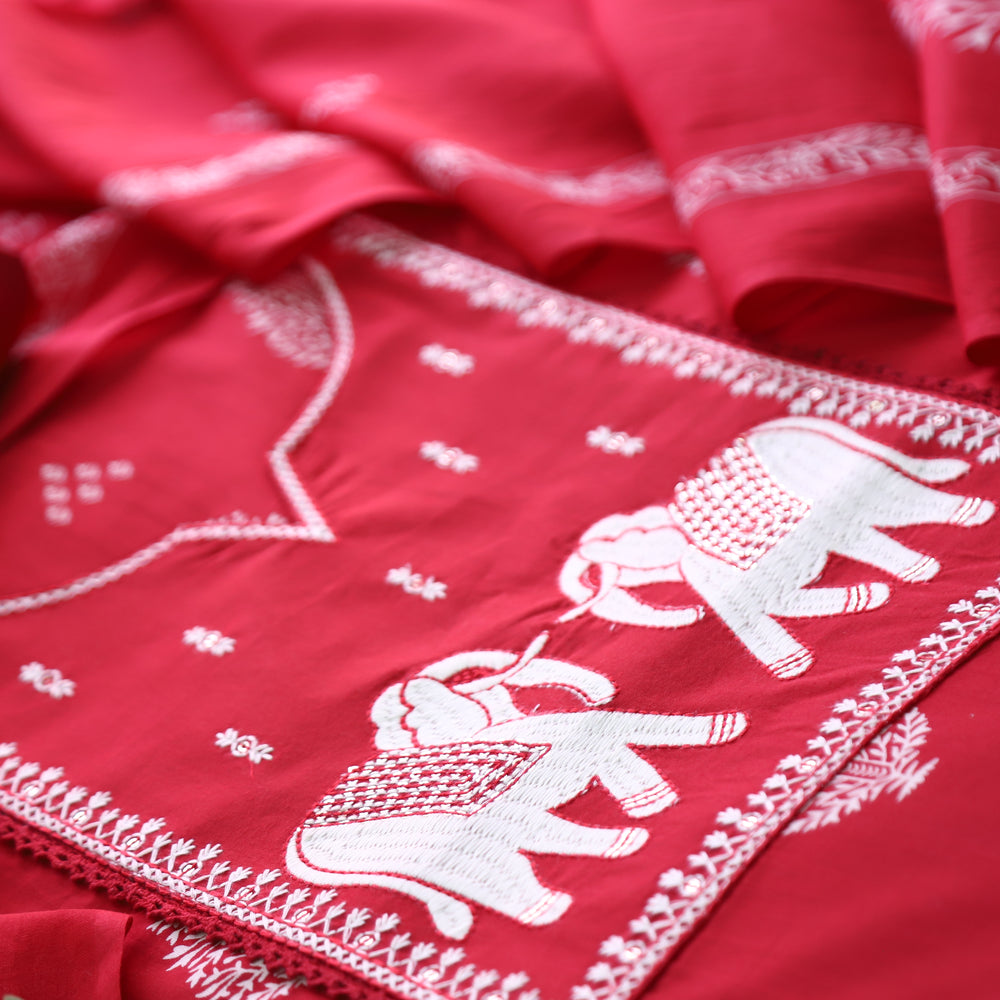 Radhika Berry Red Potli Button with Kalamakari Printed Neck Patch Cotton Suit Set