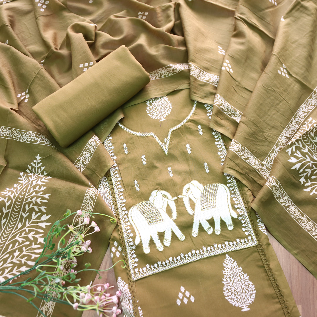 Yashvi Mehendi Green Gajj Embroidered Work Yoke Block Printed Panel Cotton Suit Set