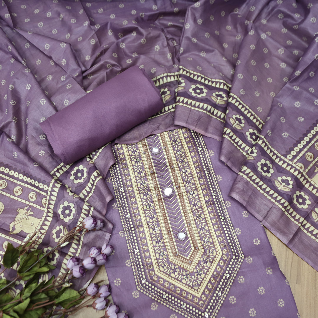 Yashvi Berry Purple Gajj Embroidered Work Yoke Block Printed Panel Cotton Suit Set
