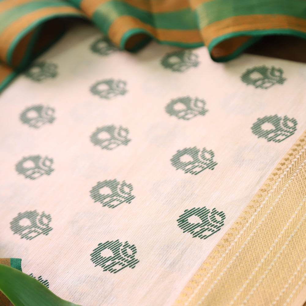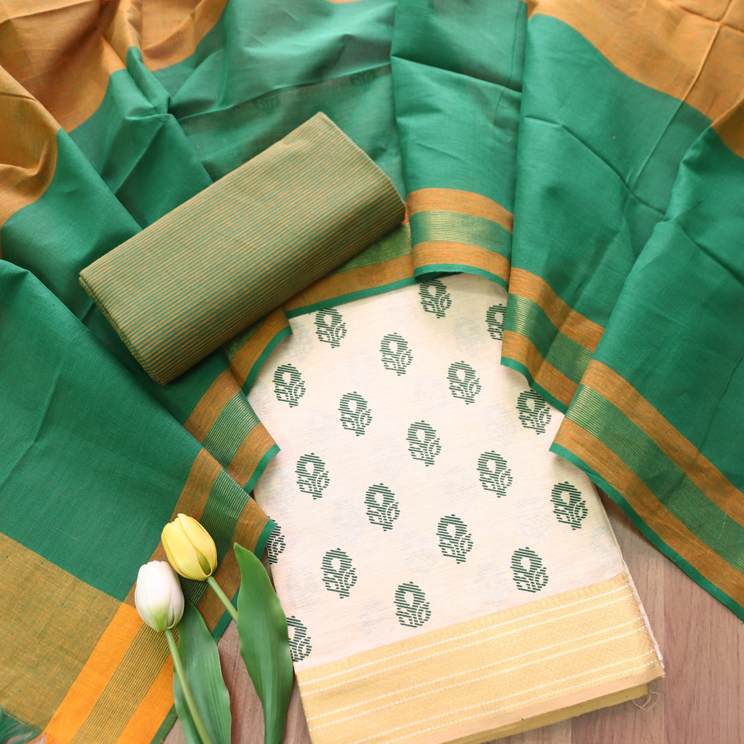 Chaahat Base Cream with Green Pigment Printed Mangalgiri Hem South Cotton Set