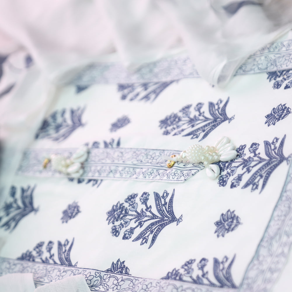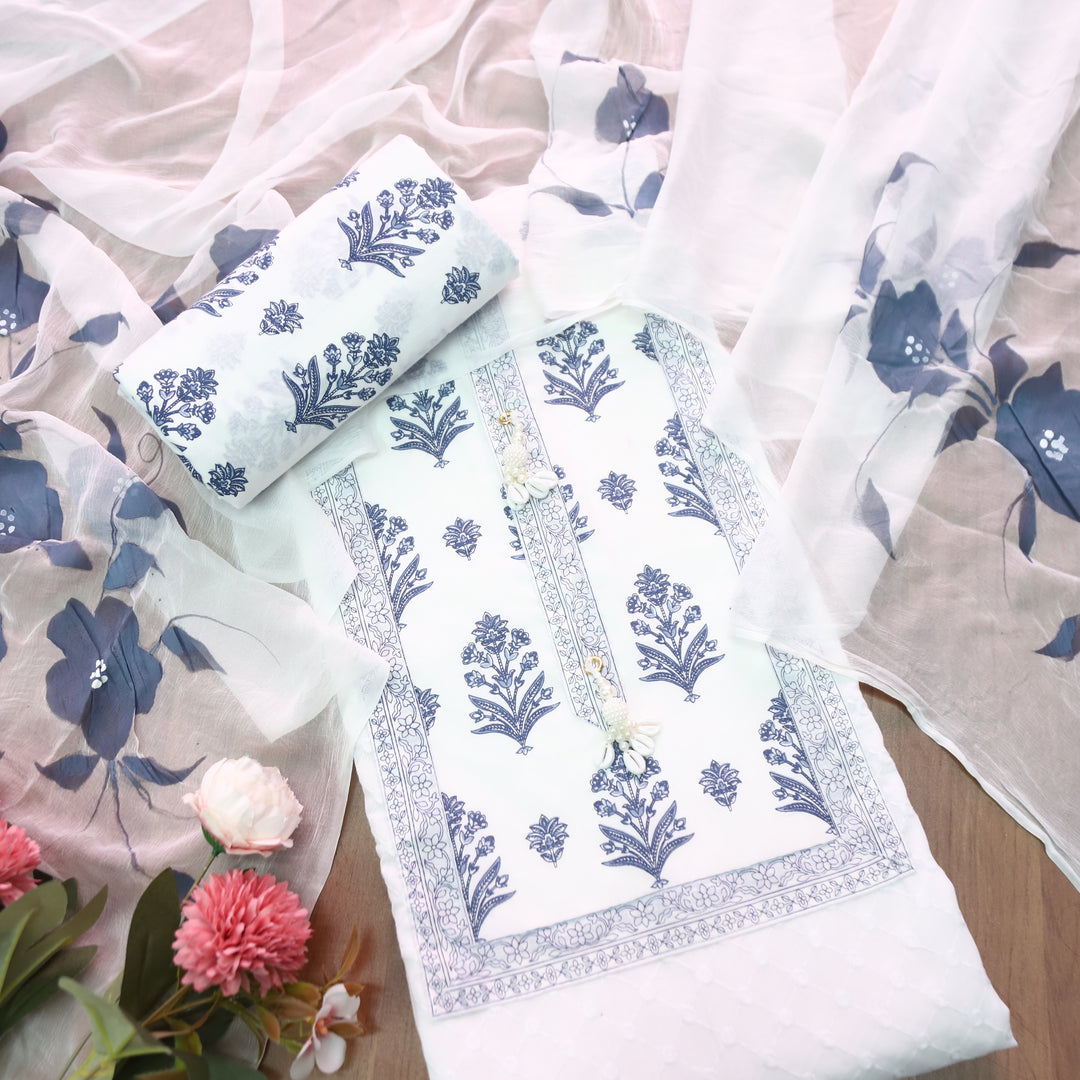 Raina White with Blue Floral Printed in All Over Thread Work Cotton Suit Set