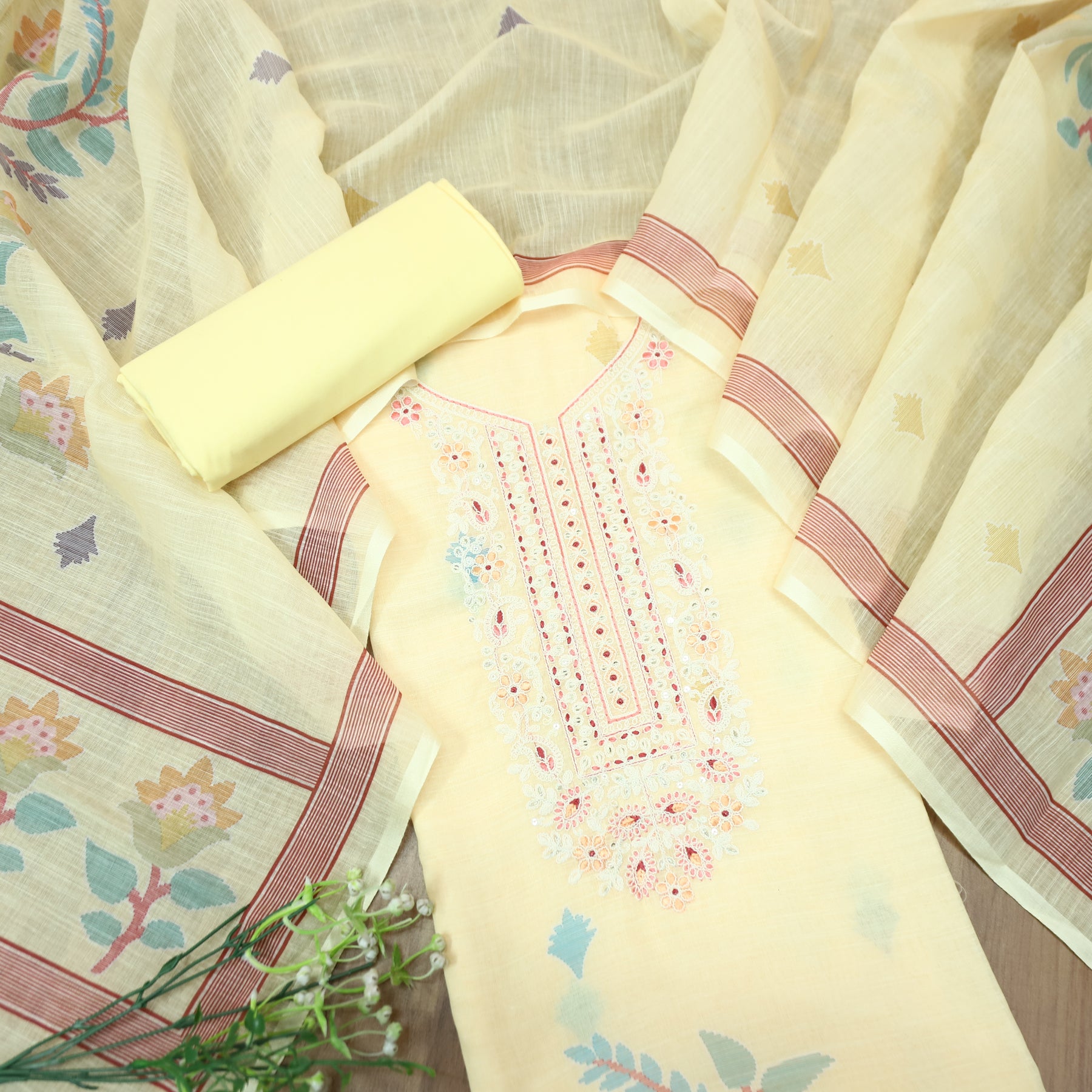 Description- Elevate your style with our exquisite thread Embroidered Work Cotton Linen Top with Embroidered Work hem paired with a matching printed Cotton Linen Dupatta with floral print cotton bottom. The intricate embroidery on the neckline adds a touch of elegance, while the lightweight and breathable Kota fabric ensures comfort.