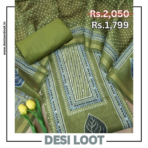 Description- A graceful shimmer tissue linen suit set featuring delicate patra work on the top, adding a soft festive sparkle. The ensemble is paired with a beautifully printed dupatta in soothing pastel tones, creating a dreamy and feminine aesthetic. Completed with a matching plain bottom, this set is perfect for subtle celebrations.