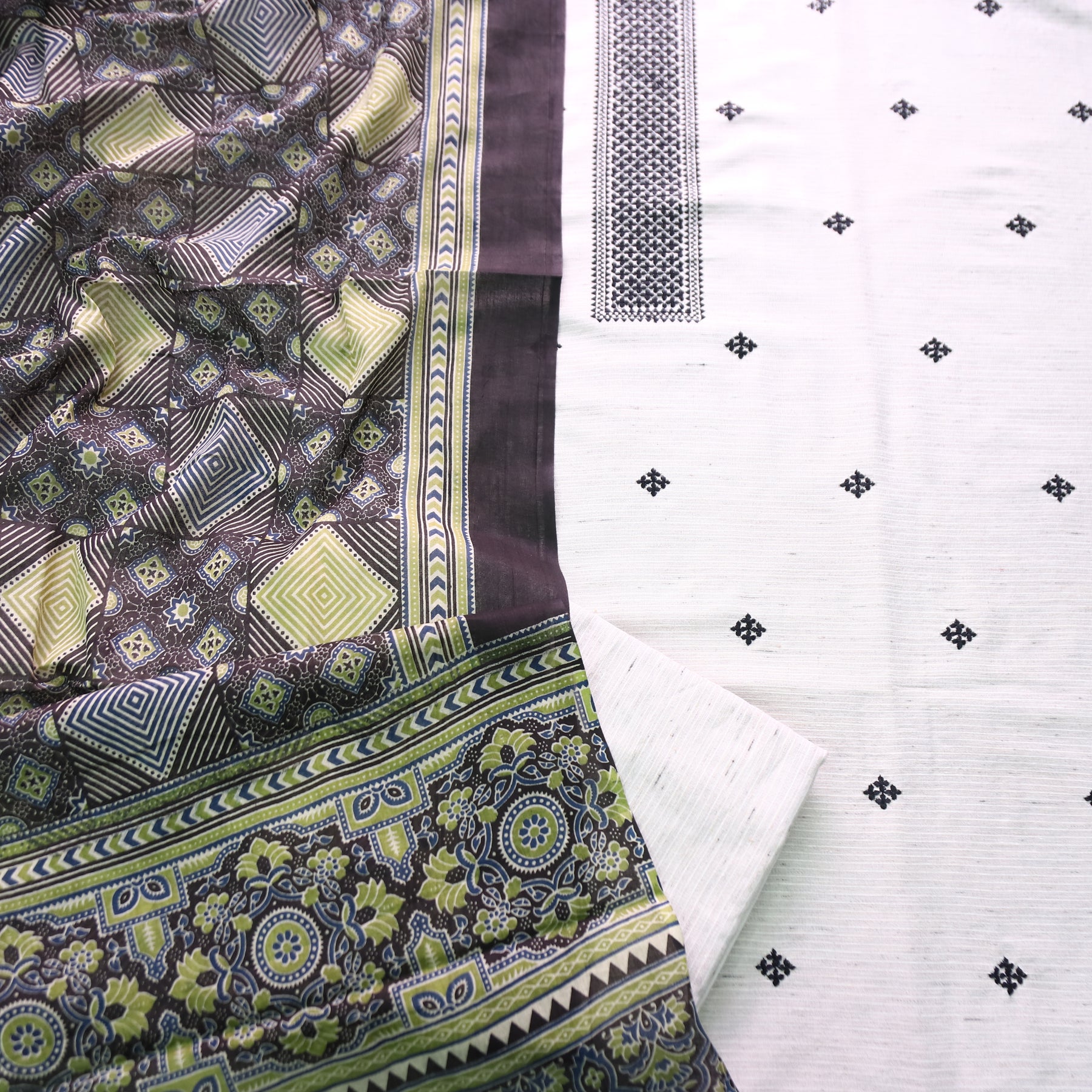 Aathiya Shell White with Black Thread Embroidered and Buti Work Cotton Suit Set