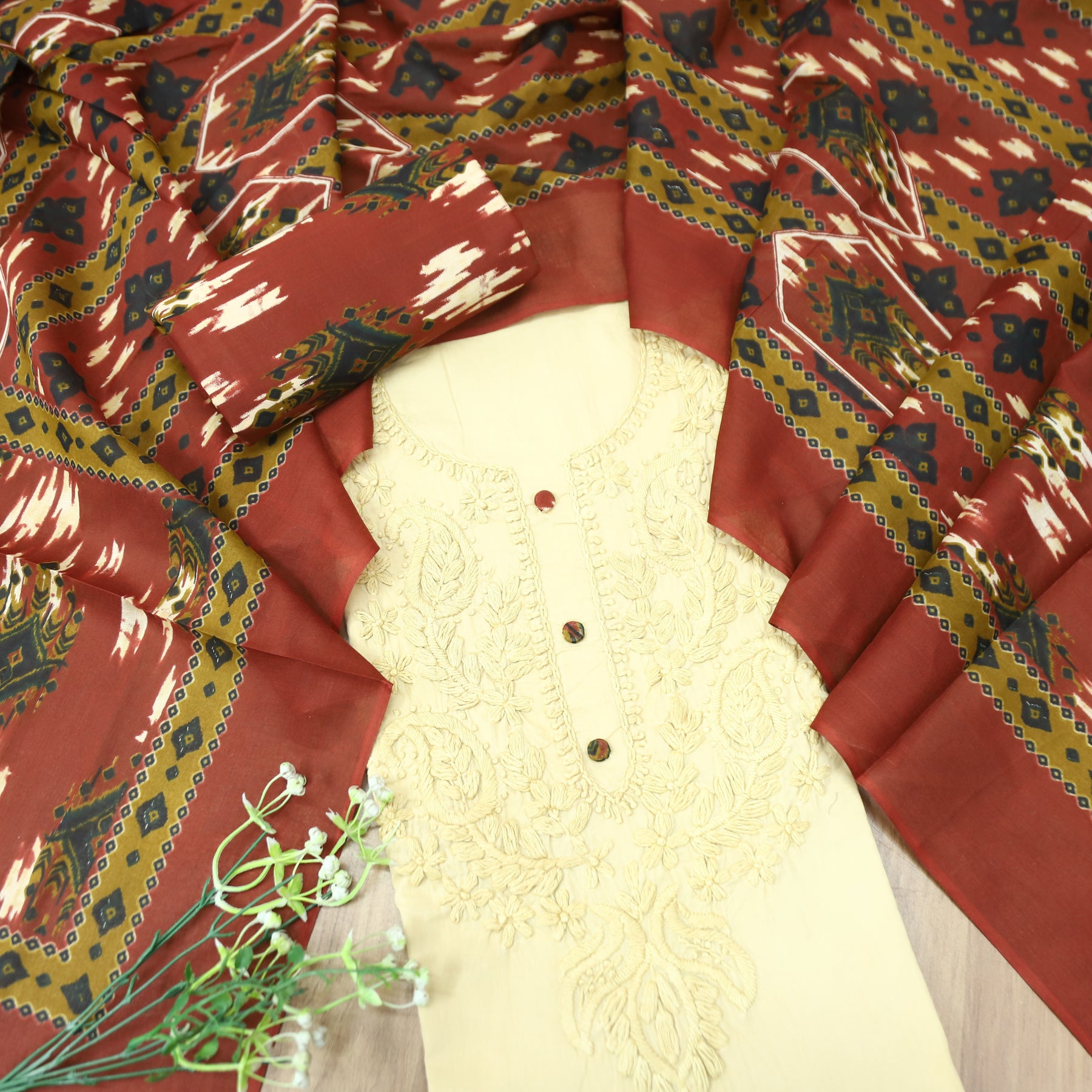 Work- This elegant cotton suit set showcases a handcrafted cotton top, adorned with a beautifully detailed enhanced with fine thread embroidery. The soft floral highlights add an artisanal charm to the design. It is paired with a printed cotton bottom for balanced comfort and a matching printed cotton dupatta featuring printed work, completing the look with light